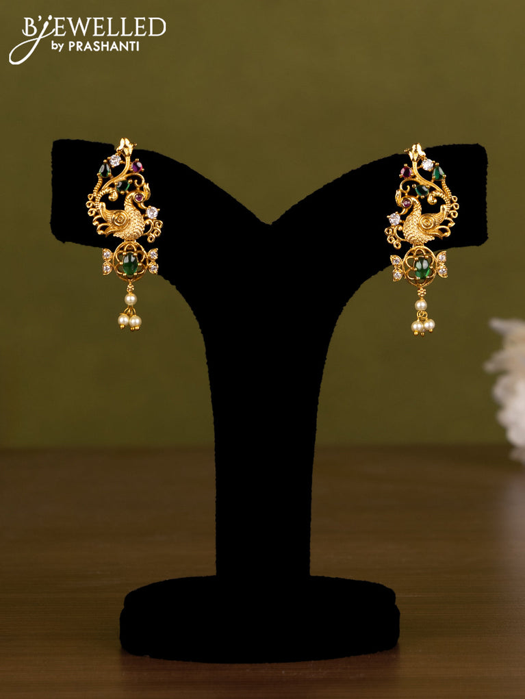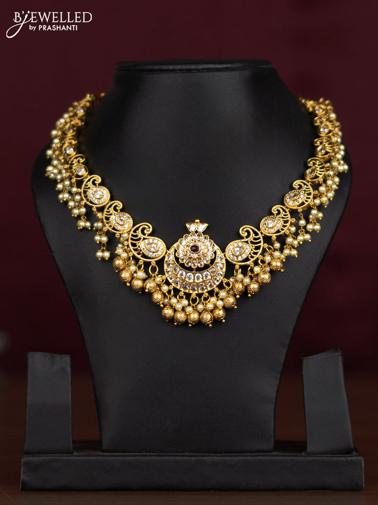 Antique guttapusalu necklace chandbali & peacock design with kemp & cz stones and pearl hangings without earrings