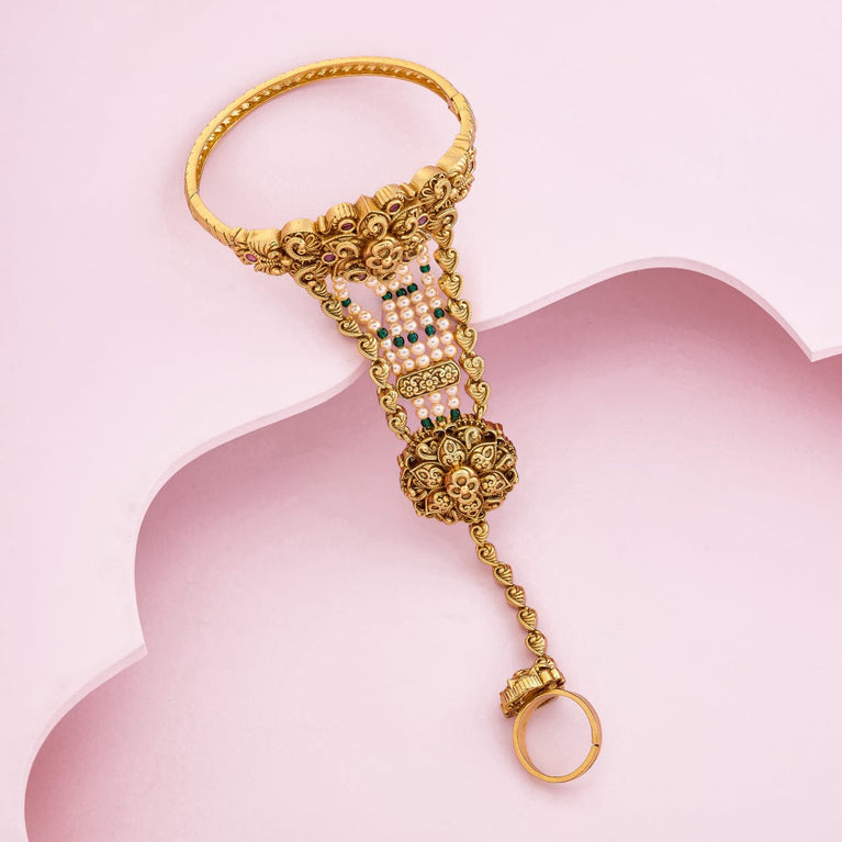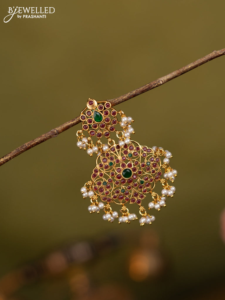 Antique hanging type jhumka with kemp & kundan stones and pearl hangings