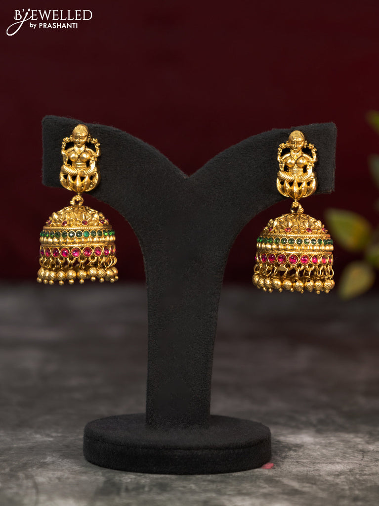 Antique jhumka lakshmi design with kemp stones and golden beads hanging