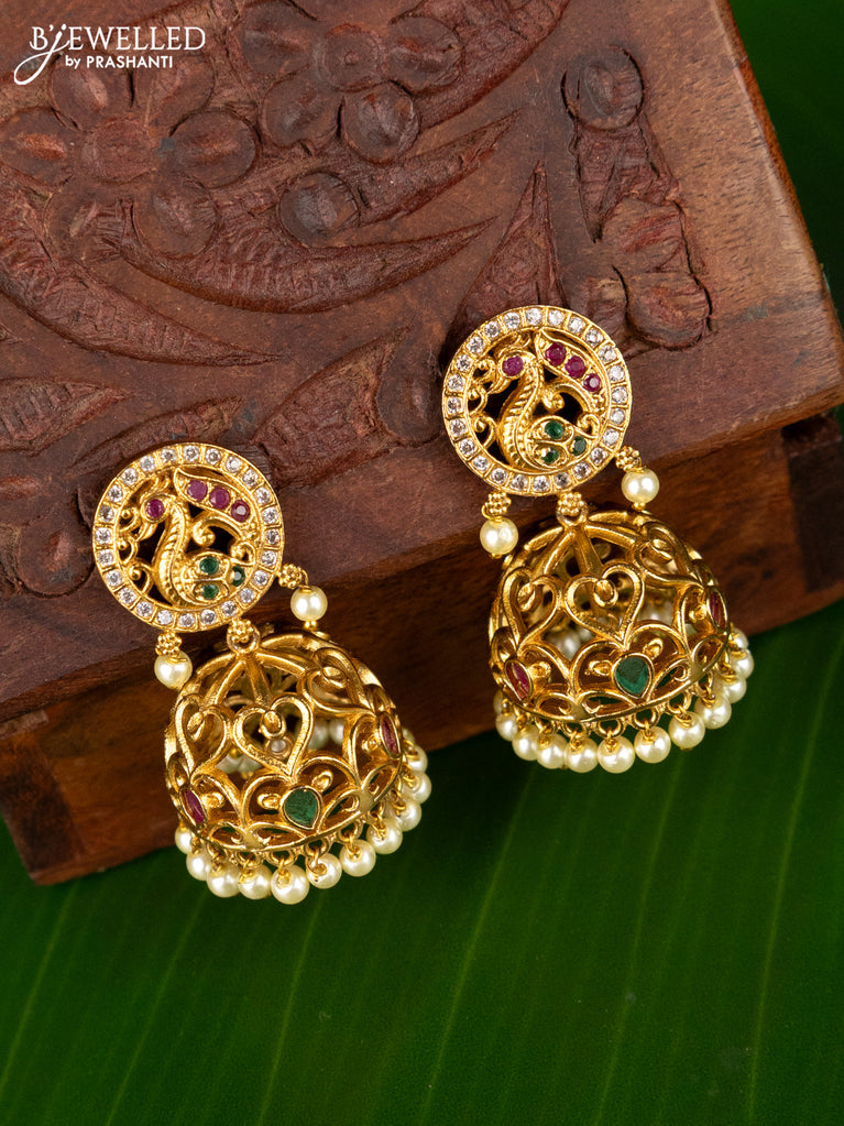 Antique jhumka peacock design with kemp & cz stones pearl hangings