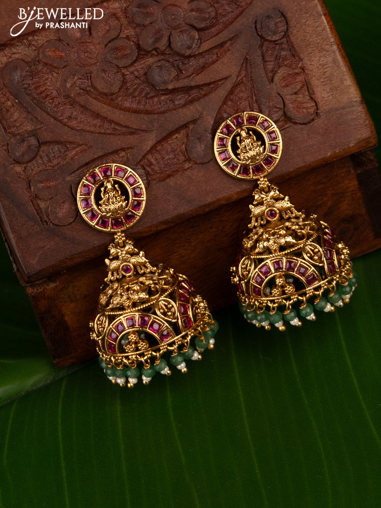 Antique jhumka lakshmi design with pink kemp stones and green beads hanging