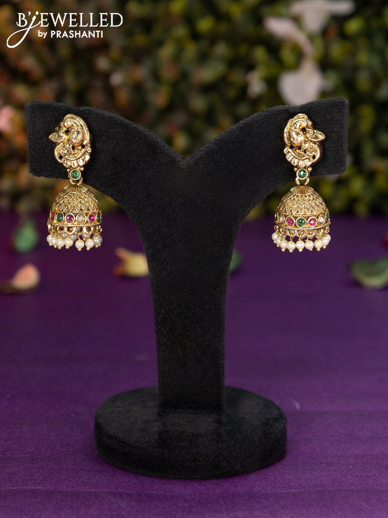 Antique jhumka peacock design with kemp stones and pearl hangings