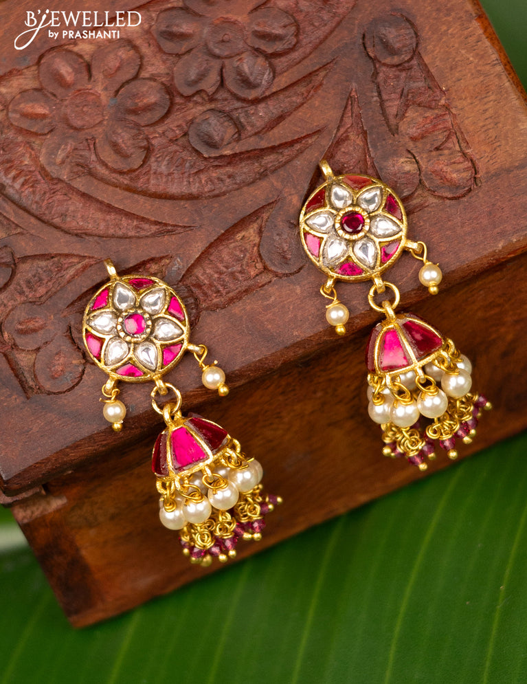 Antique jhumka with pink jadau kundan stones and pearl & beads hanging