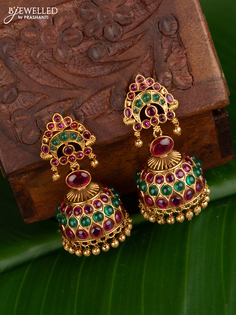 Antique jhumkas with kemp stone and golden beads hangings