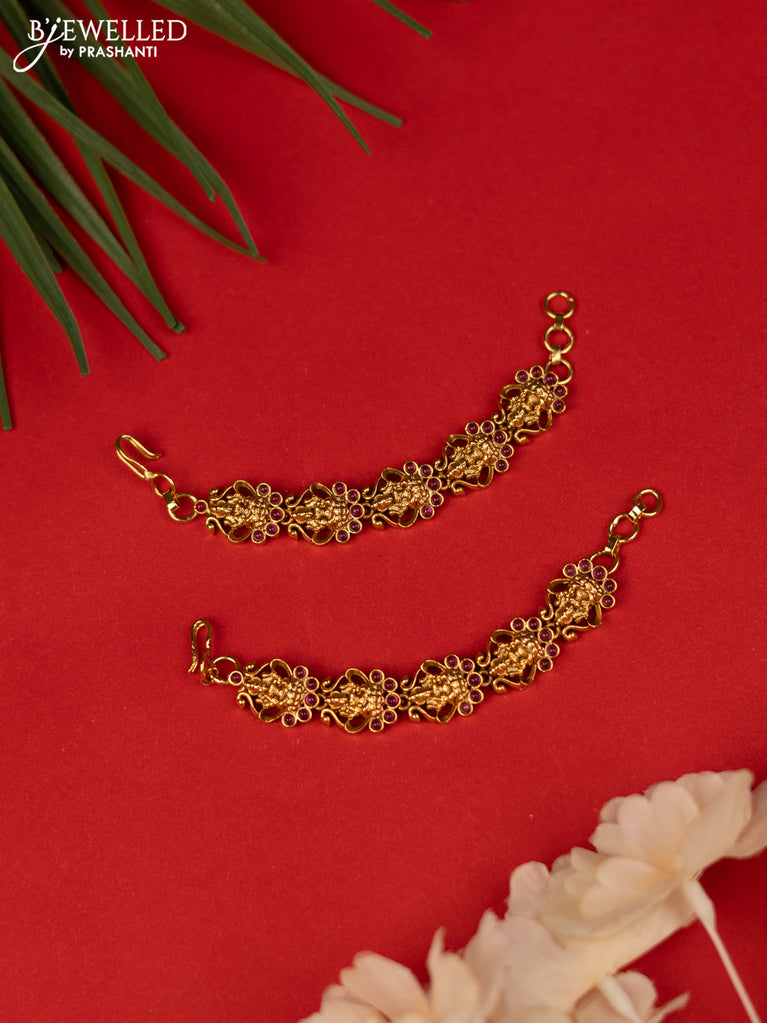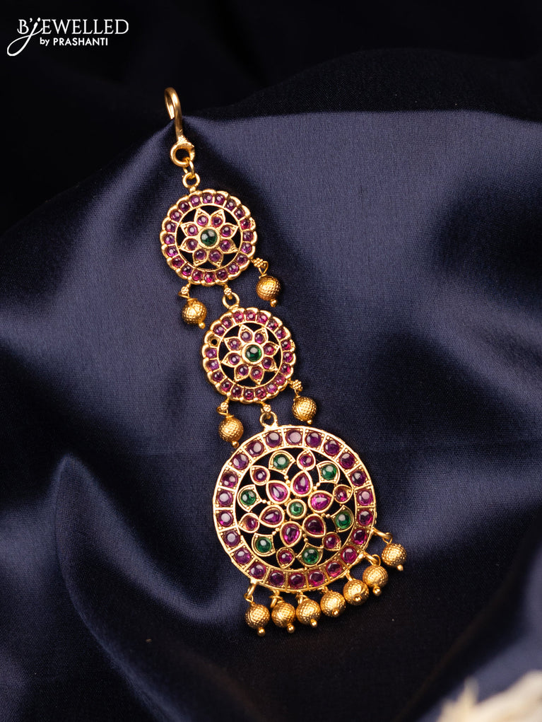 Antique maang tikka with pink kemp & cz stones and golden beads hangings
