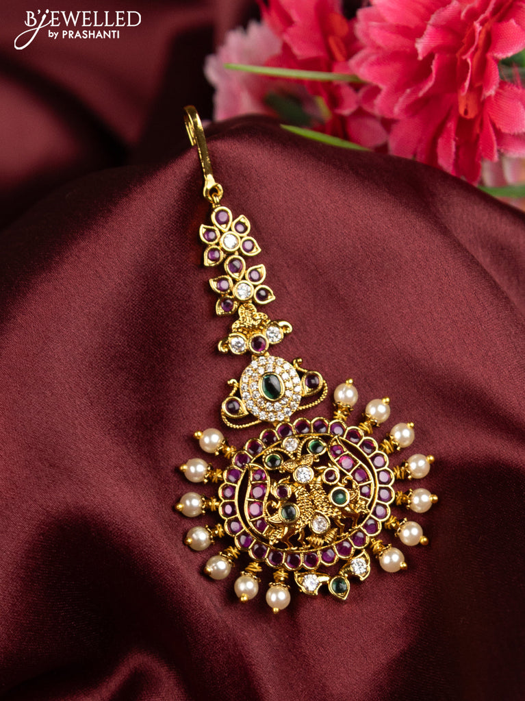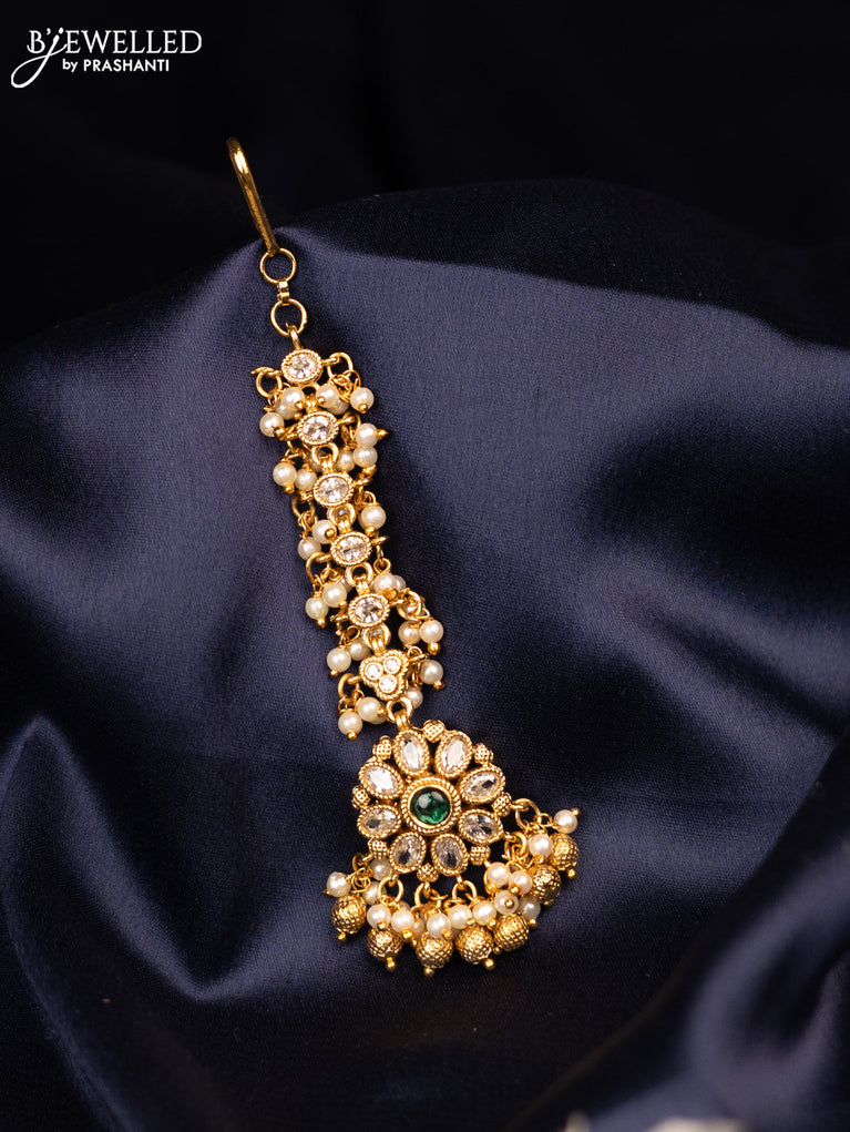 Antique maang tikka with kemp & cz stones and pearl hangings
