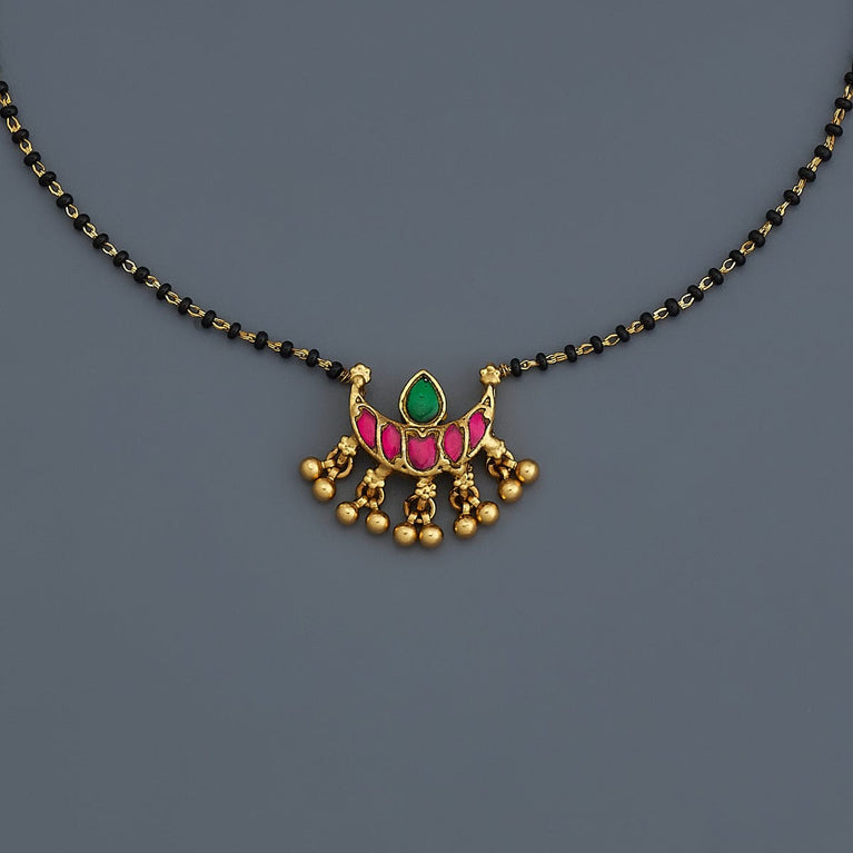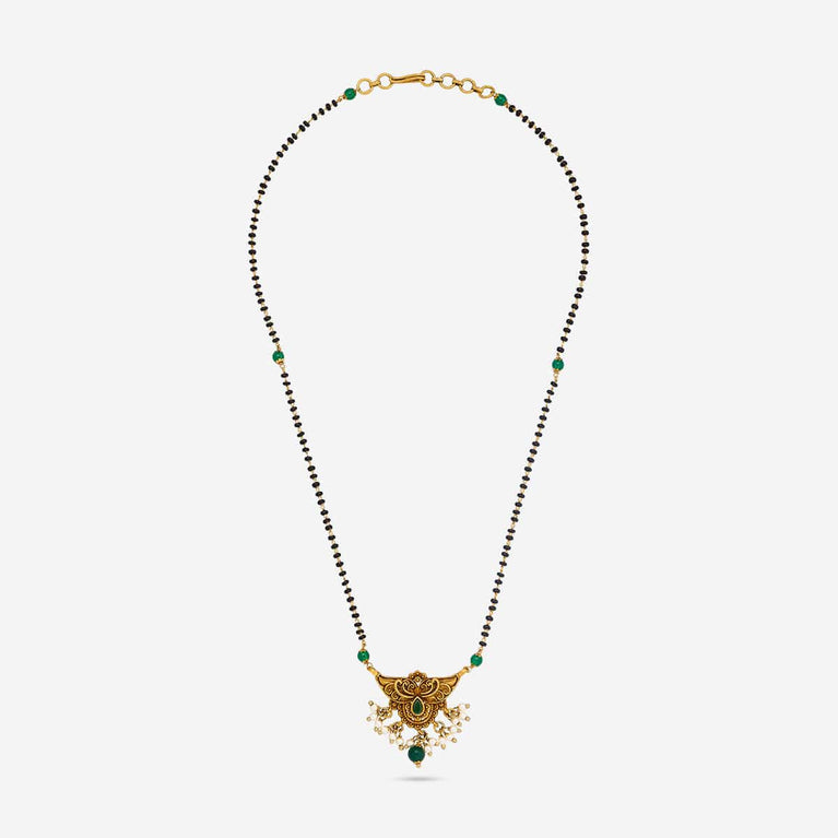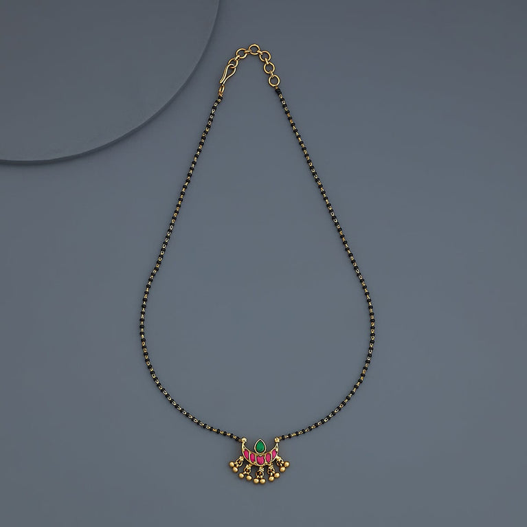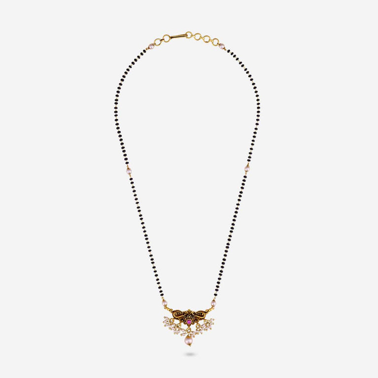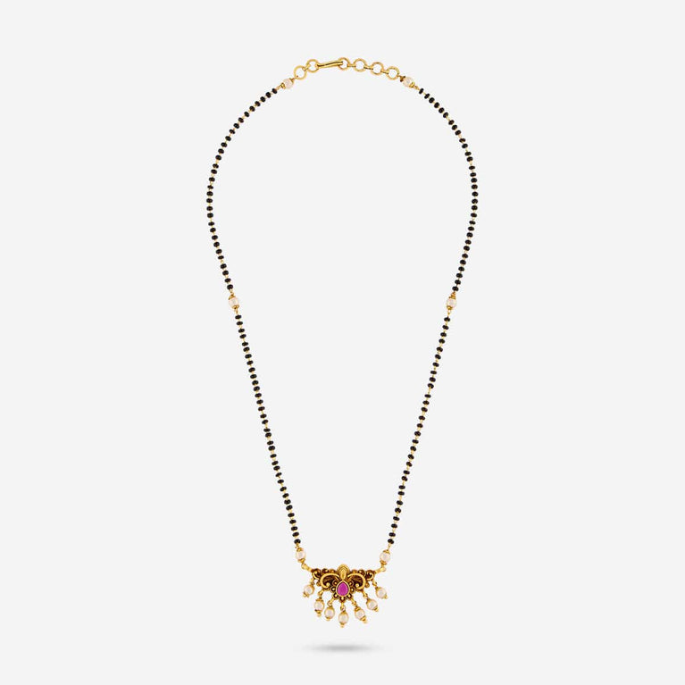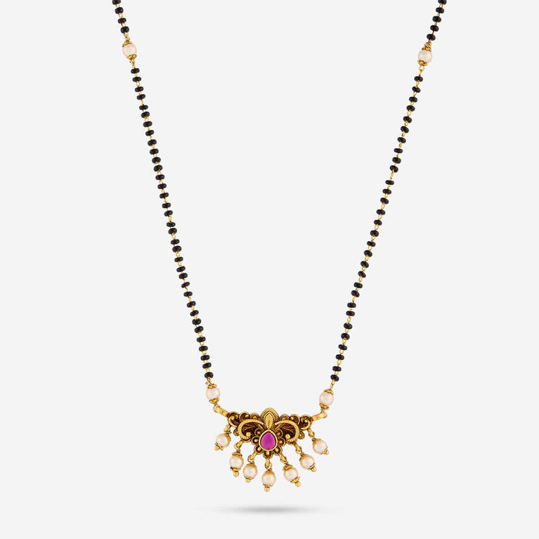 Kushal's Fashion Jewellery Flower Motif Antique MangalsutraIf you want to avoid the hassle of pairing your favourite Mangalsutra with earrings, allow our latest set of antique Mangalsutra and matching earrings to handle it for you. Thanks to its studded ruby stones with gold polish, this mangalsutra set with marvellous earrings will be your perfect partner for all events.