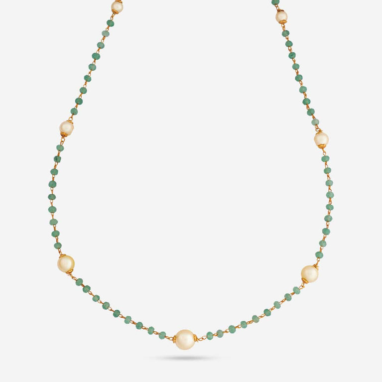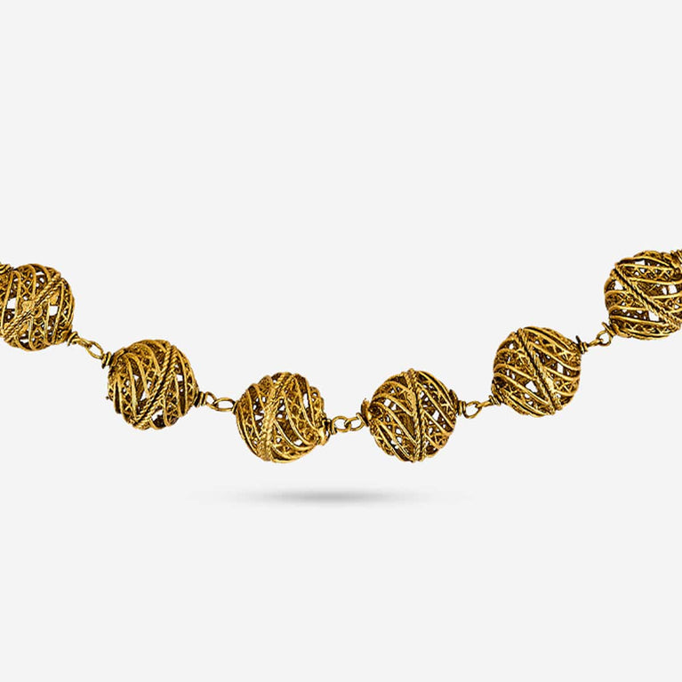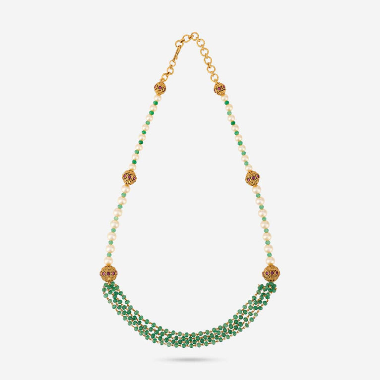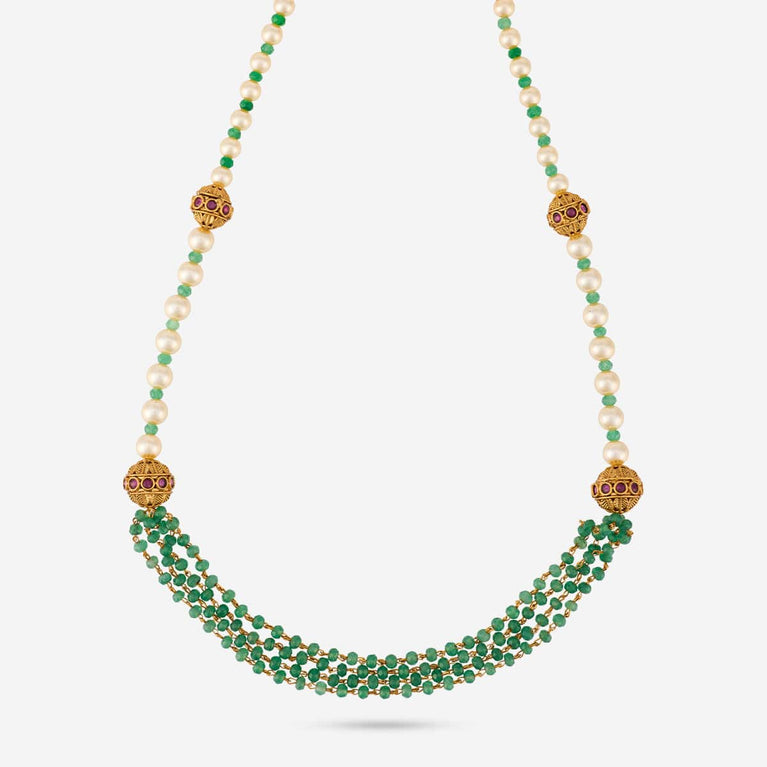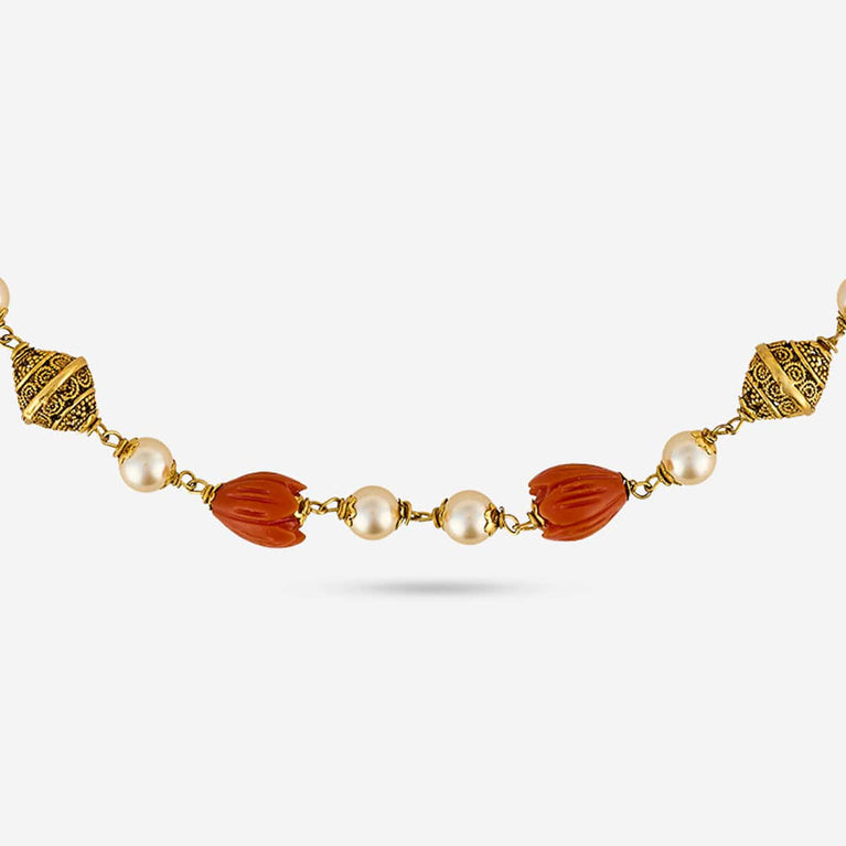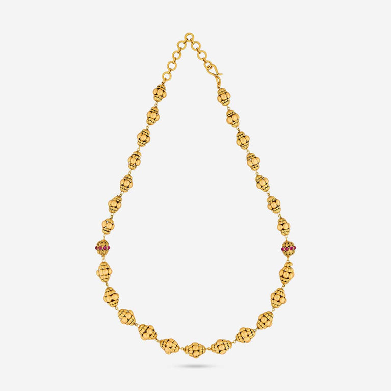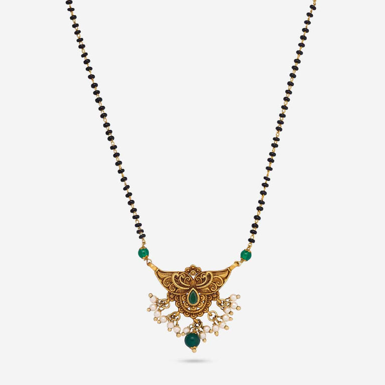 Kushal's Fashion Jewellery Flower Motif Antique MangalsutraIf you want to avoid the hassle of pairing your favourite Mangalsutra with earrings, allow our latest set of antique Mangalsutra and matching earrings to handle it for you. Thanks to its studded ruby stones with gold polish, this mangalsutra set with marvellous earrings will be your perfect partner for all events.