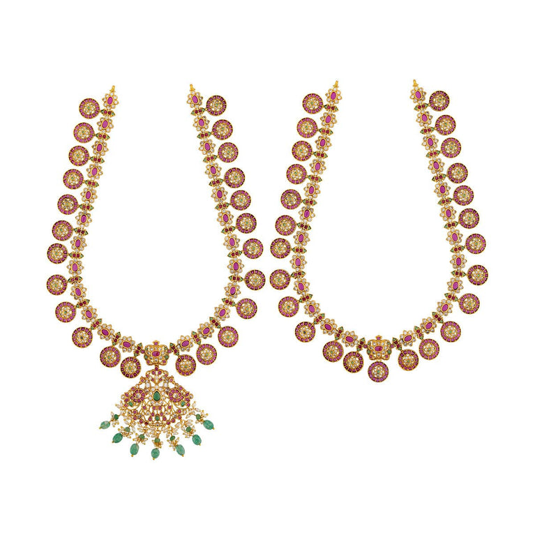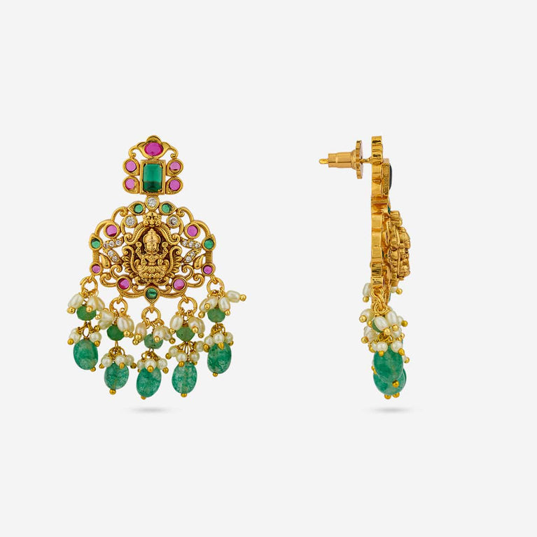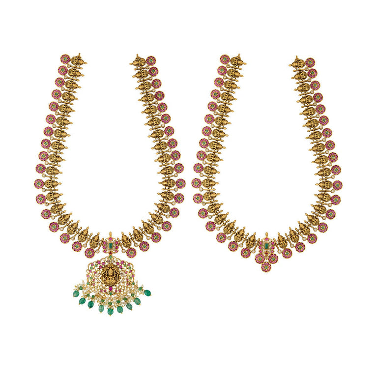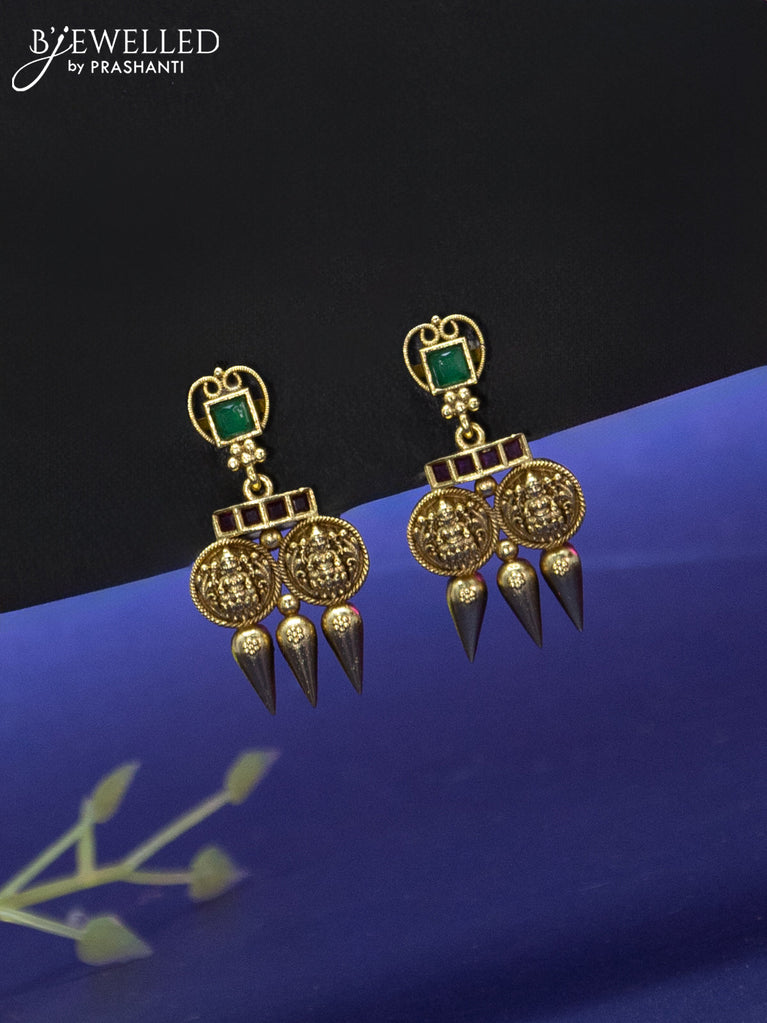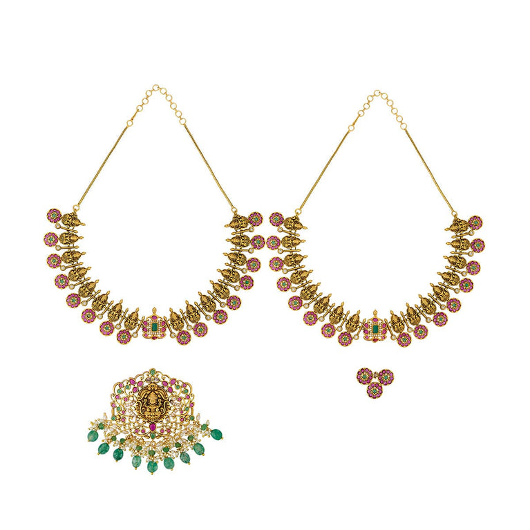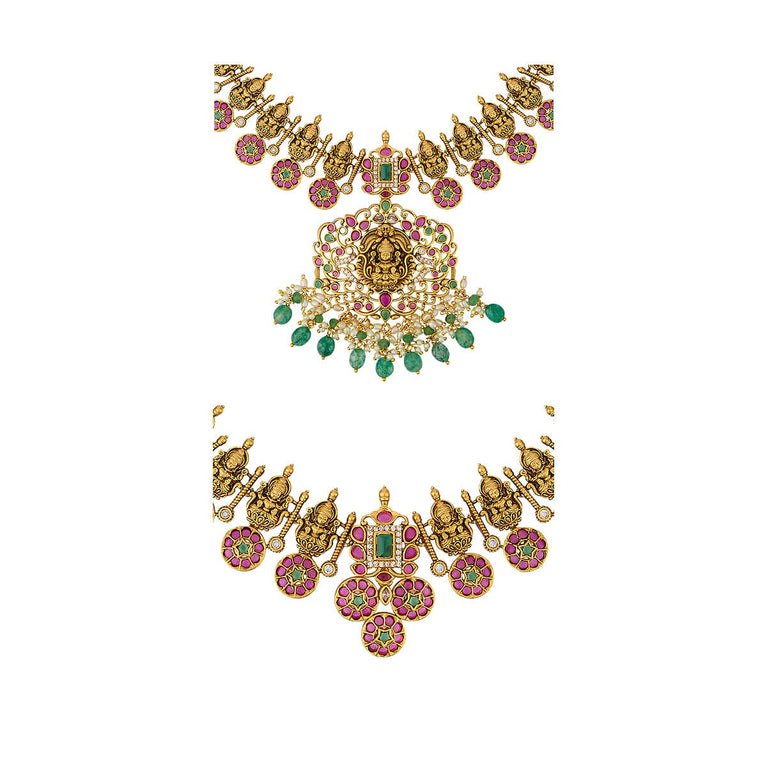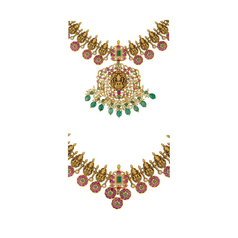 Antique necklace lakshmi design with emerald & cz stones and golden beads hangings