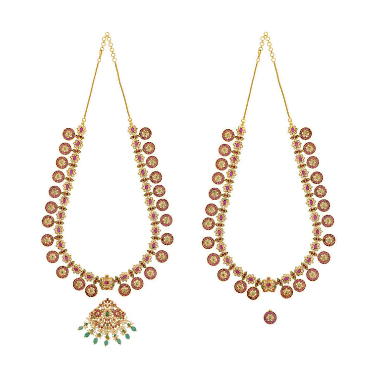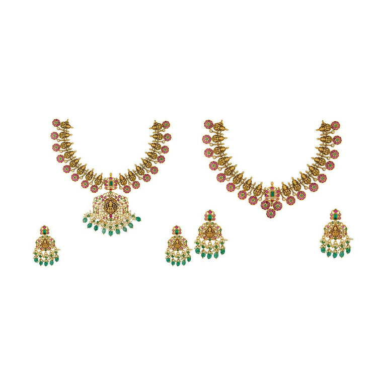 Antique necklace lakshmi & peacock design with kemp stones and pearl hangings