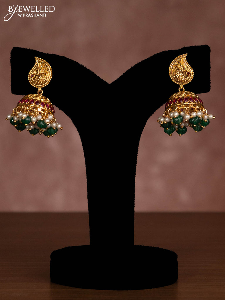 Antique necklace peacock design with kemp & cz stones and pearl & green beads hanging without earrings