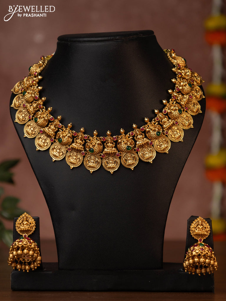 Antique necklace lakshmi design with pink kemp stones and green beads hanging