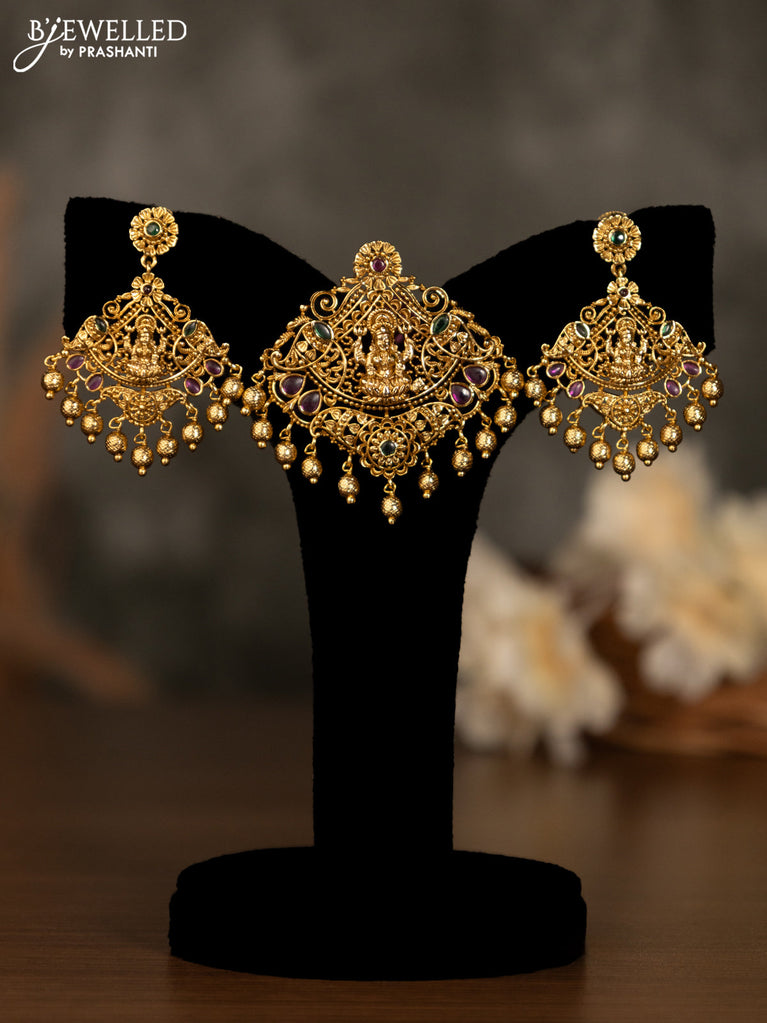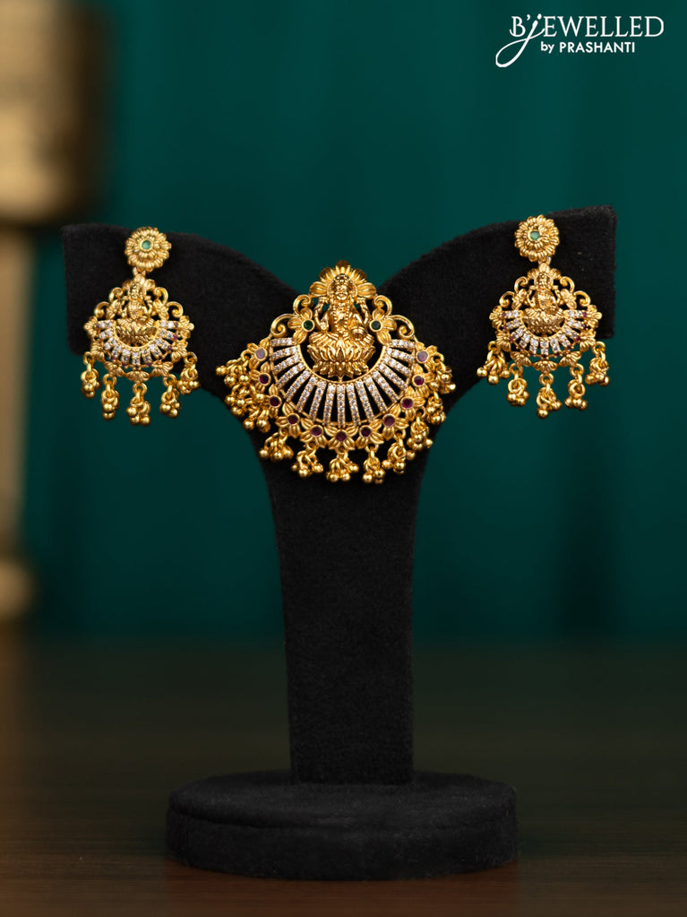 Antique pendant set lakshmi design with kemp & cz stones and golden beads hanging