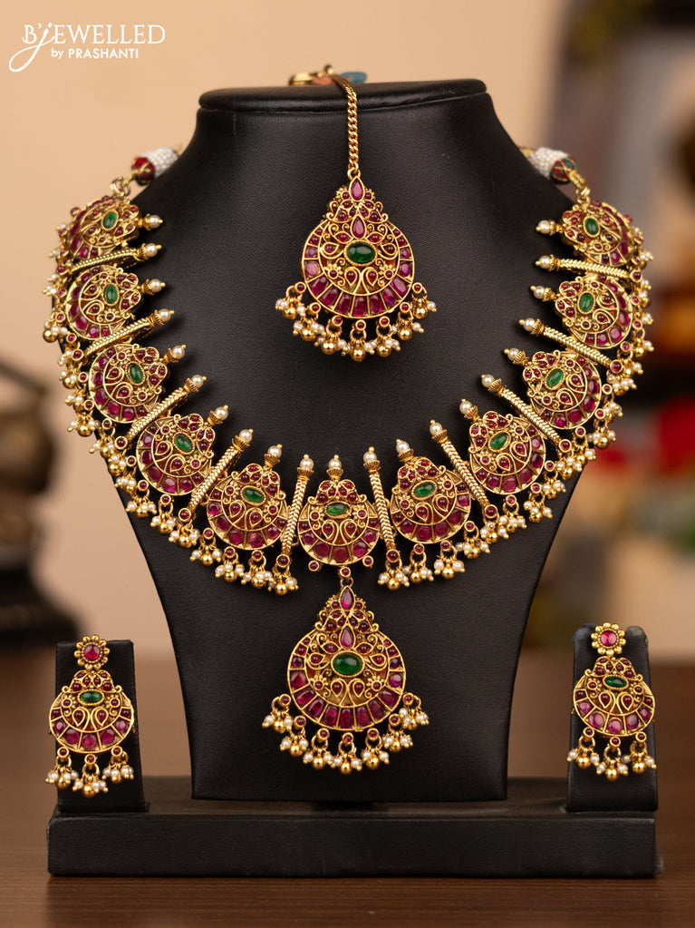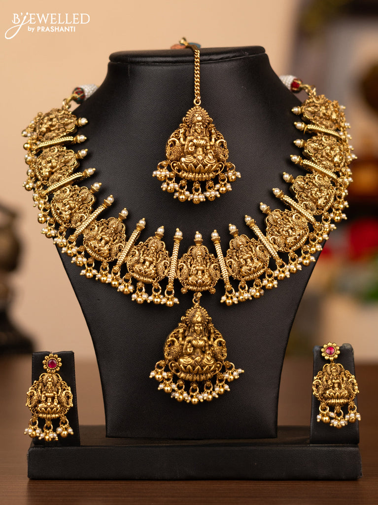 Antique reversible necklace lakshmi & chandbali pendant with kemp stones and pearl & golden beads hanging