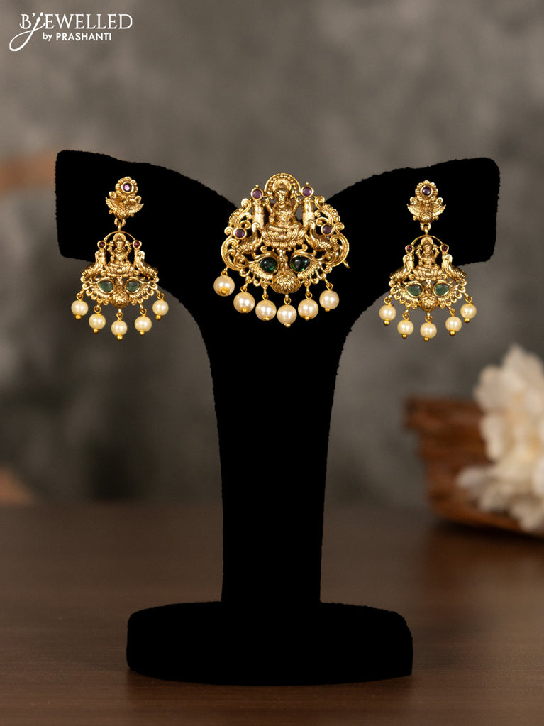 Antique pendant set lakshmi design with kemp stones and pearl hangings