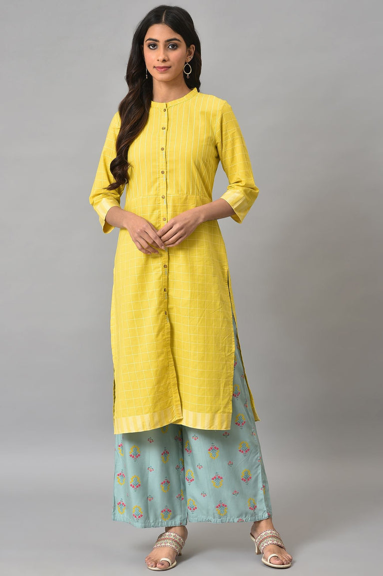 Crafted in our exclusively designed cotton fabric, this kurta is tailored for around-the-clock activities. It features a classic silhouette with unique crystal buttons. This leno stripe kurta has round neckline and cuff sleeves. It is paired with straight fit trouser pants.