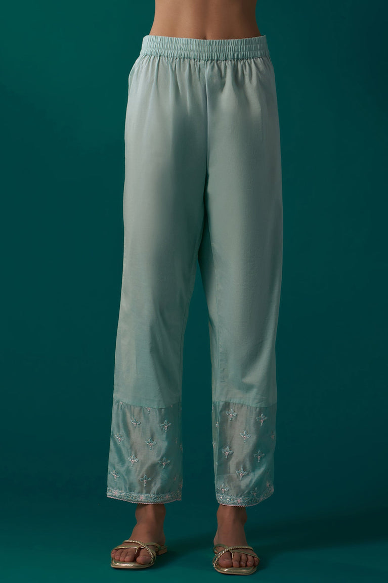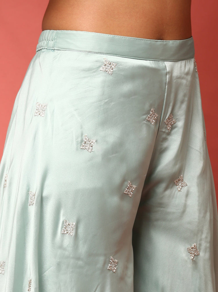 Aqua Mint Thread Embroidered Silk Chanderi Flared Kurta, Straight Pant and Dupatta Set