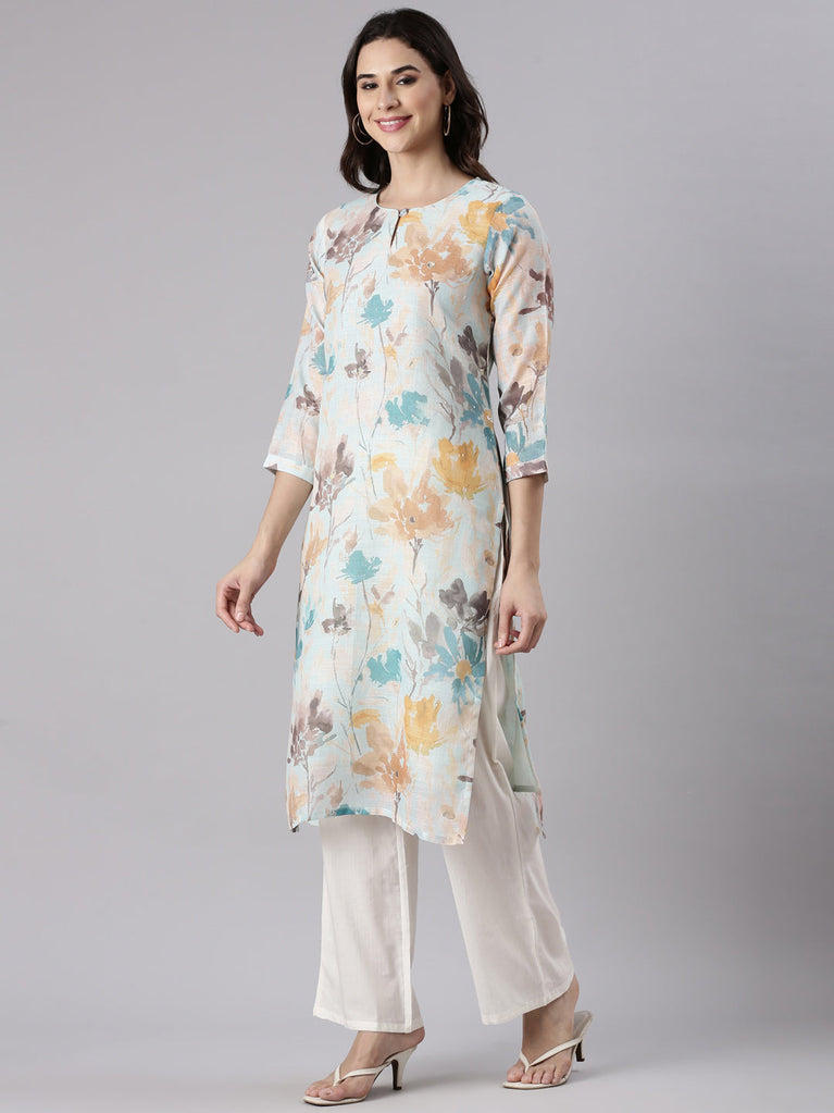 Get A Statement Look In This Fusion kurta Set By W. The Set Includes Aqua Blue Floral Printed Straight kurta In Keyhole Neckline And Features Thread Embroidery. It Is Coordinated With Matching Floral Printed Parallel Pants In Mid-Rise With Partially Elasticated Waistband And Multicoloured Chiffon Dupatta.
