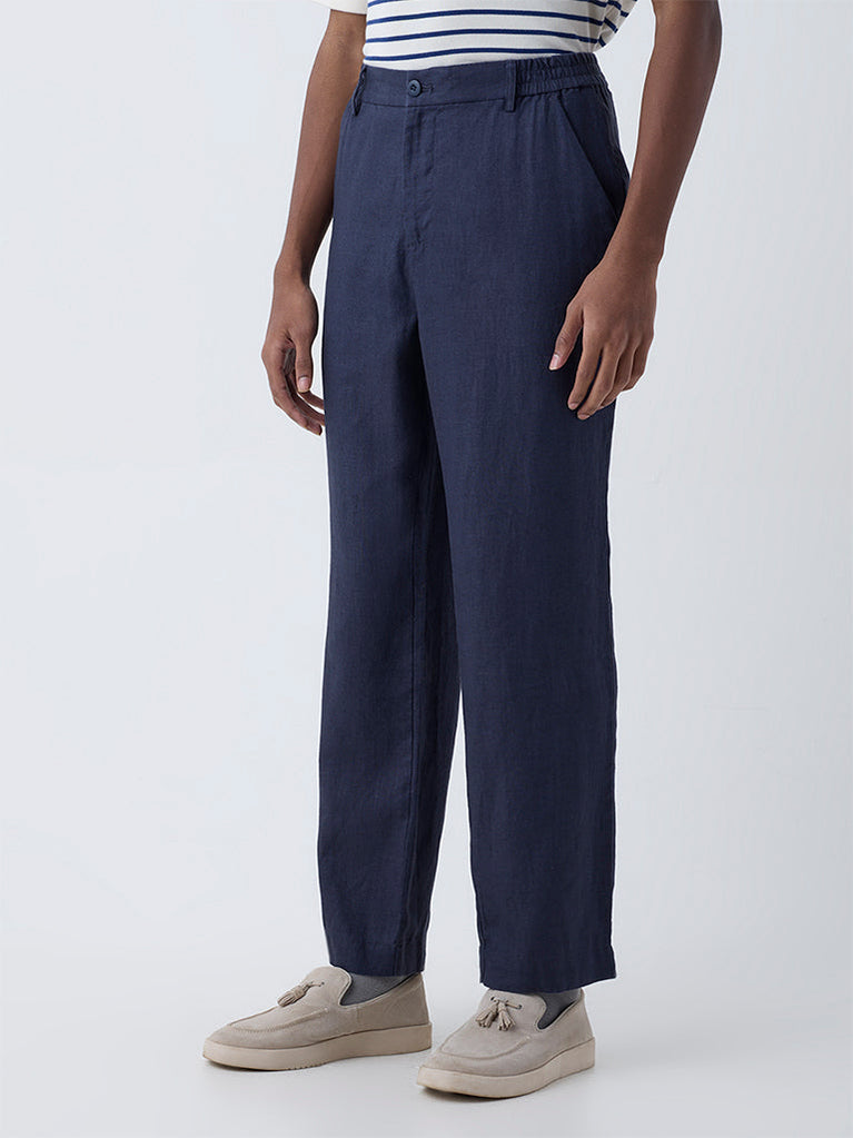 Ascot Indigo Solid Relaxed-Fit Mid-Rise Linen Trousers