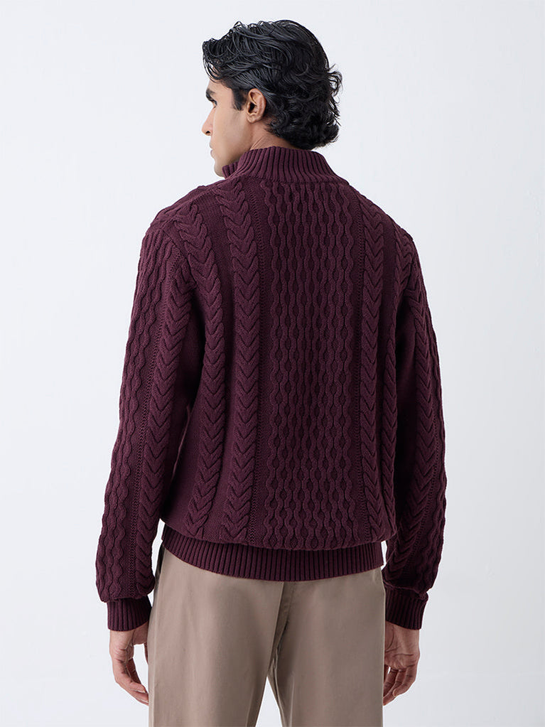 Ascot brings this wine sweater, woven from pure cotton and detailed with a cable-knit pattern that adds texture and character. Featuring a high neck, a short zipper closure and full sleeves, it combines practicality with refined design. Comfortable and timeless, it serves as a go-to layer for cool-weather styling