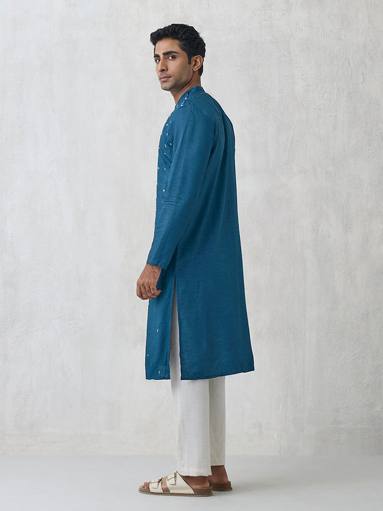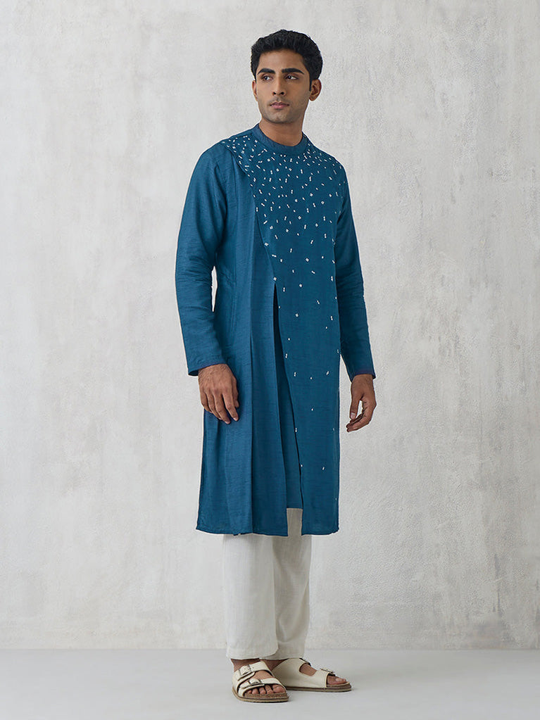 Celebrate in style with this navy kurta from Samoh, designed with pintuck pleats and silver dots. A draped plaid layer adds dimension, while long sleeves and a round neckline complete its festive appeal.