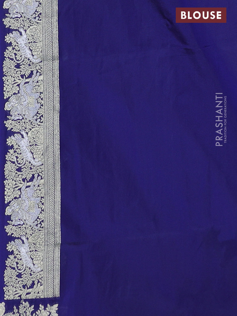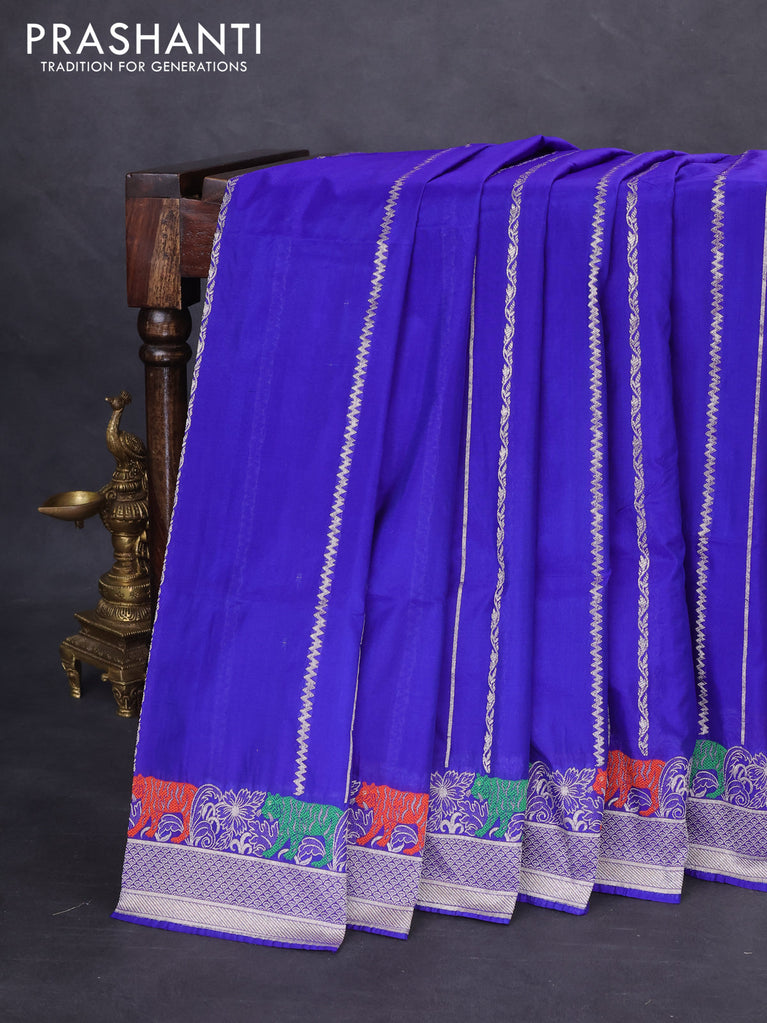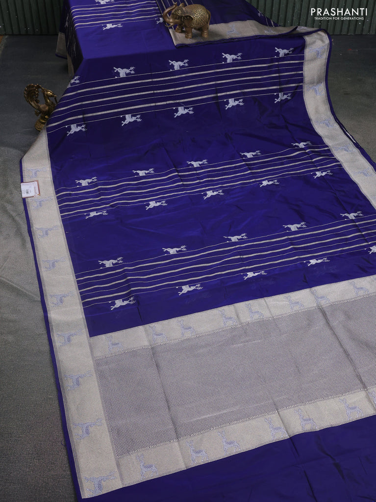 Banarasi semi katan silk saree dark blue with allover silver & gold zari weaves and deer design zari woven border