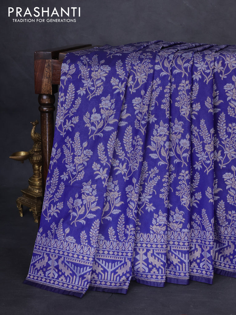 Banarasi semi katan silk saree dark blue with silver zari woven buttas and rich zari woven border