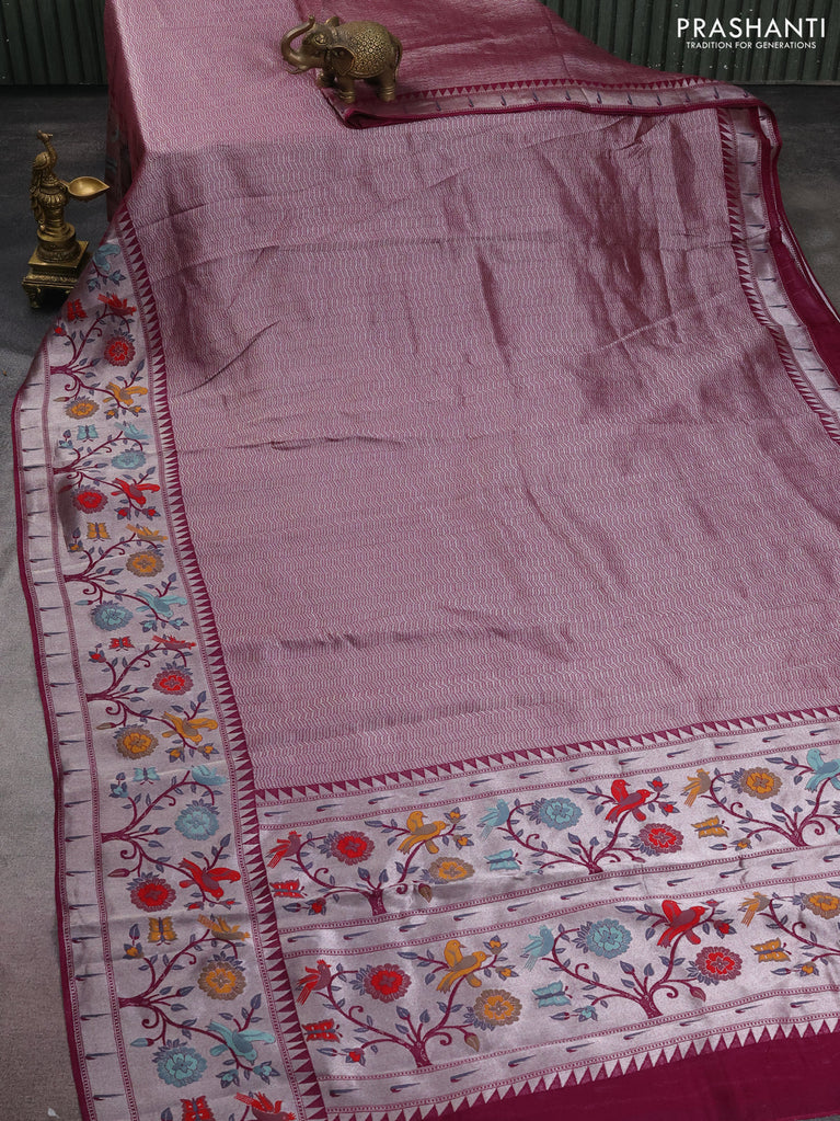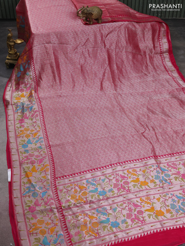 Banarasi semi raw silk saree pink with allover silver zari woven paithani weaves and silver zari woven border