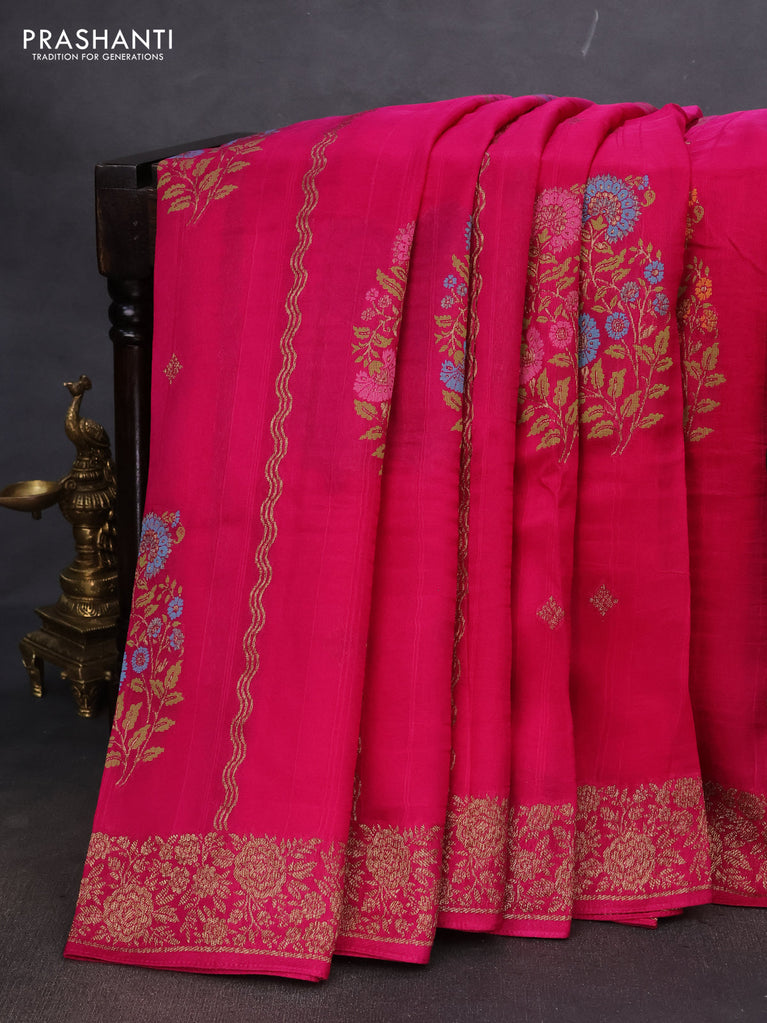 Banarasi semi raw silk saree pink with allover zari woven brocade weaves and floral design paithani border