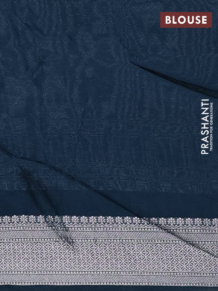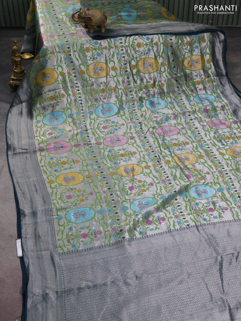 Banarasi semi raw silk saree peacock blue with allover silver woven brocade weaves and floral design paithani border