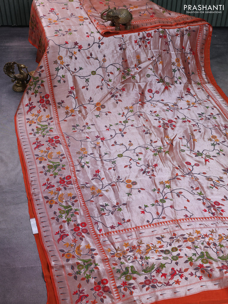 Banarasi semi raw silk saree orange with zari woven floral design paithani weaves and floral design paithani border