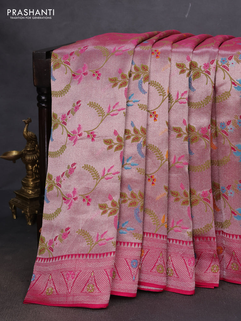 Banarasi semi raw silk saree pink with allover silver zari woven floral weaves and floral design paithani border