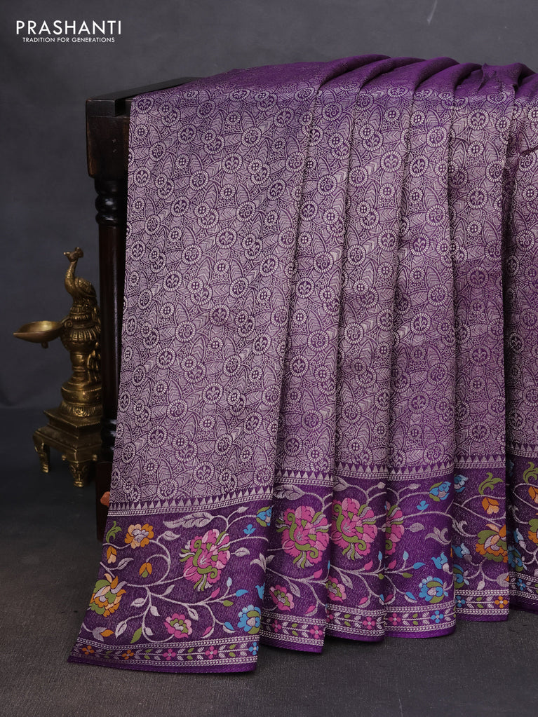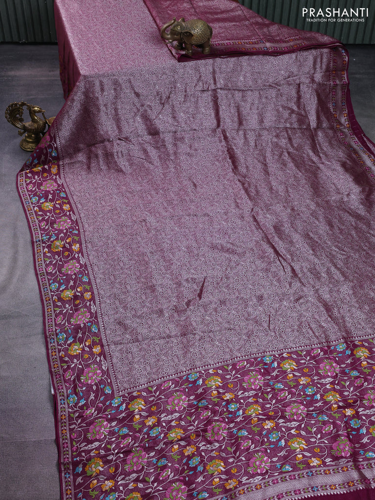 Banarasi semi raw silk saree violet with allover silver zari woven floral weaves and floral design paithani border