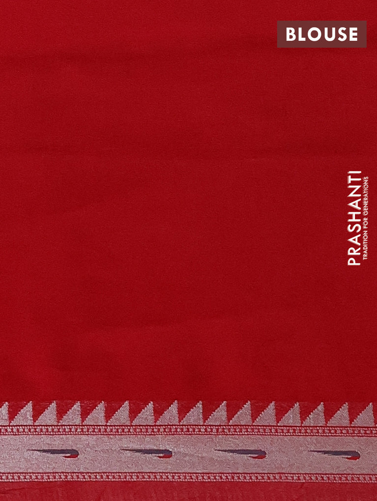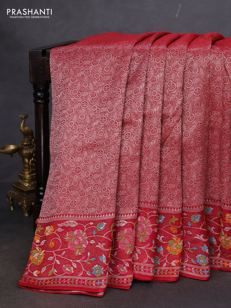 Banarasi semi raw silk saree red with allover silver zari woven brocade weaves and floral design paithani border