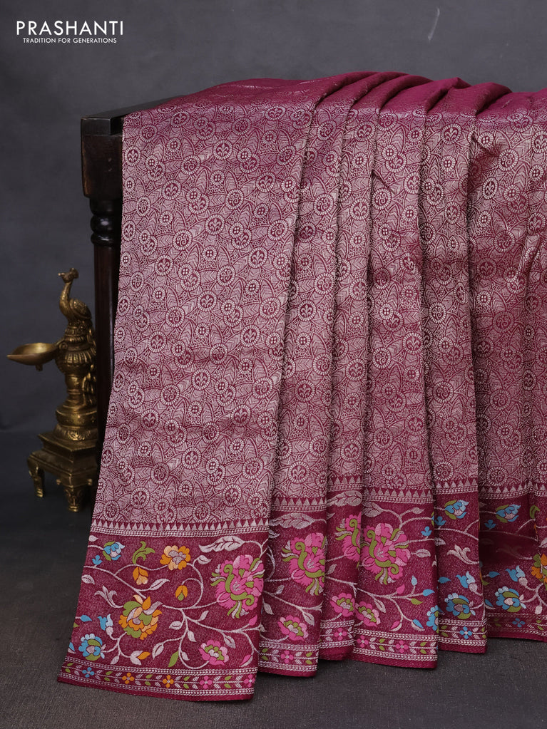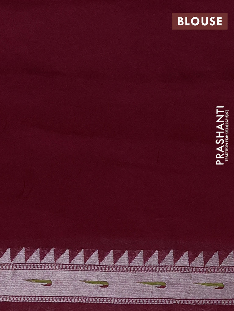 Banarasi semi raw silk saree wine shade with allover silver zari woven paithani weaves and woven border