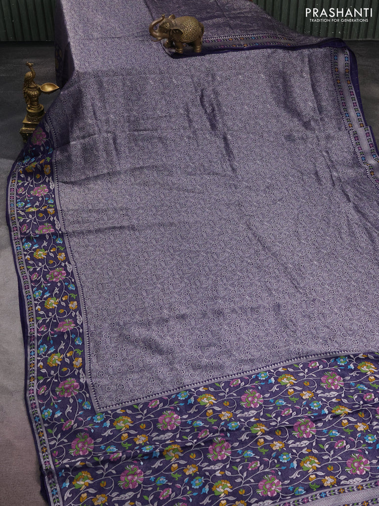 Banarasi semi raw silk saree navy blue with allover silver zari woven brocade weaves and floral design paithani border