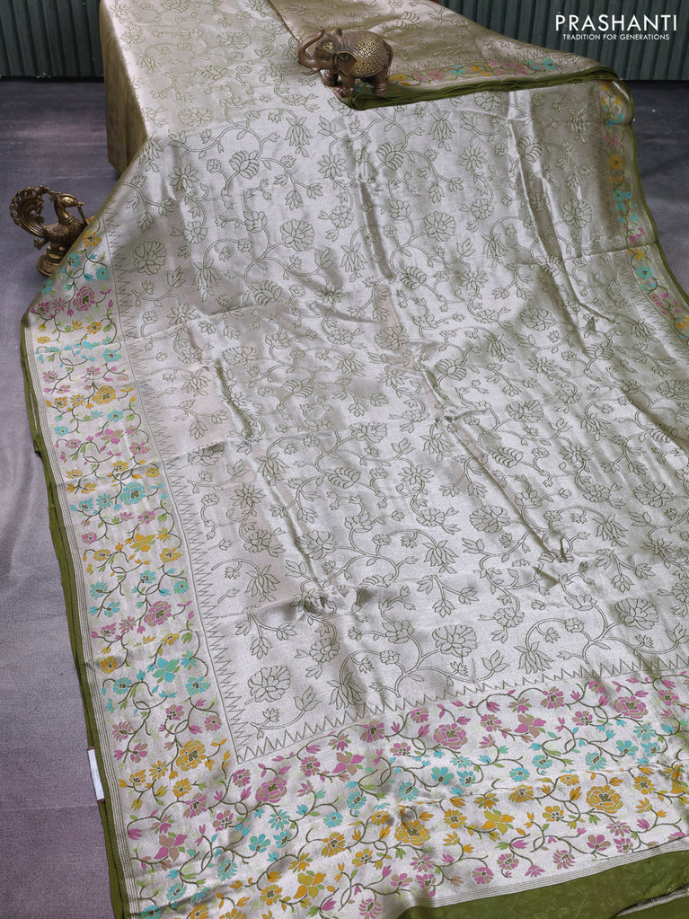 Banarasi semi raw silk saree mehendi green with allover silver zari woven floral weaves and floral design paithani border