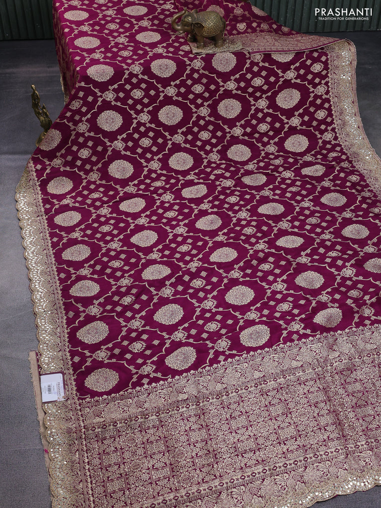 Banarasi silk saree wine shade with allover zari woven jaal weaves and gotapatti work border