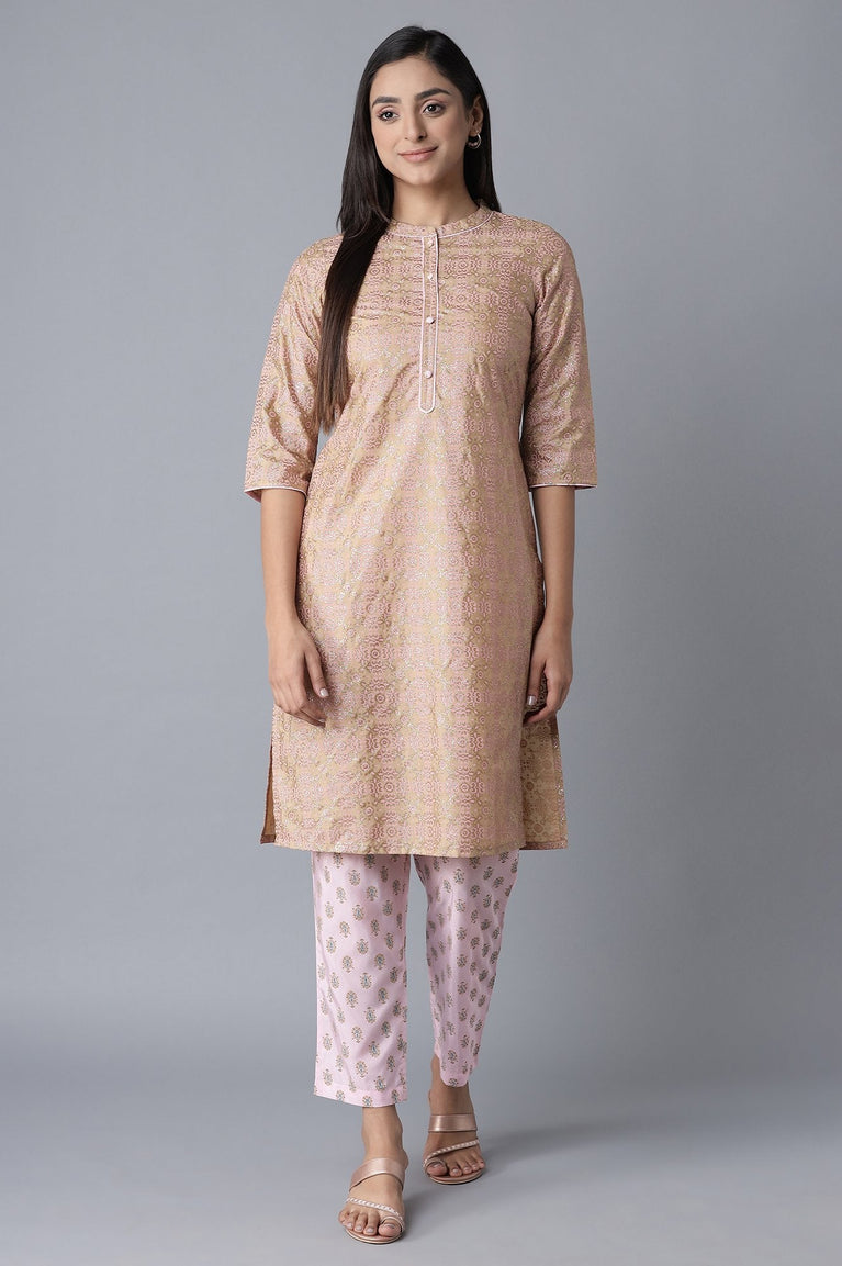 Beige glitter print kurta with embroidery on centre front. The kurta has mandarin collar and three-quarter sleeves.