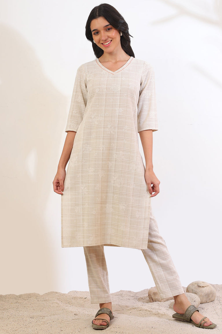 Beige Printed Cotton Blend Straight Kurta & Trousers Set