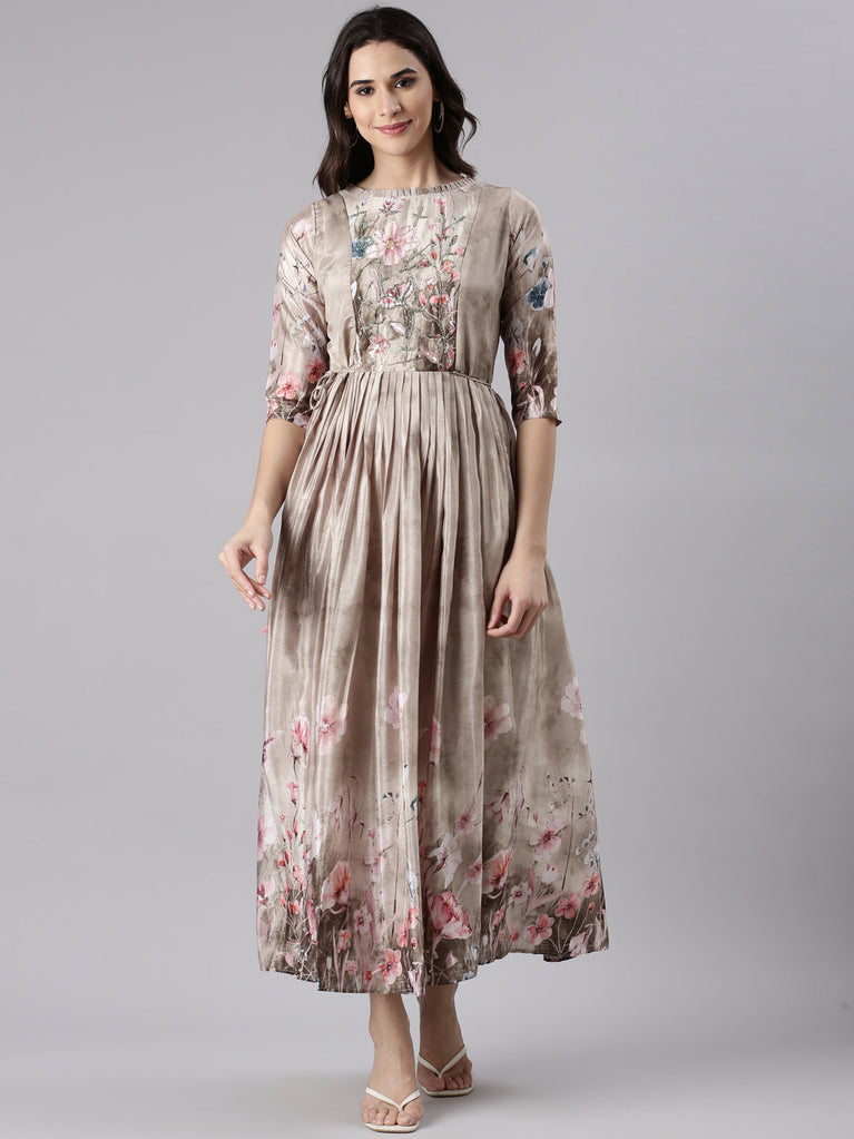 Beige Silk Printed Long Frock
