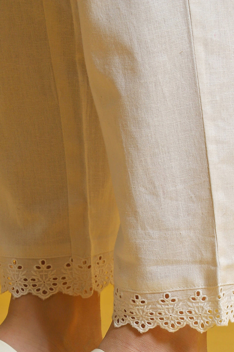 Beige Solid Lace Cotton Blend Straight Pants