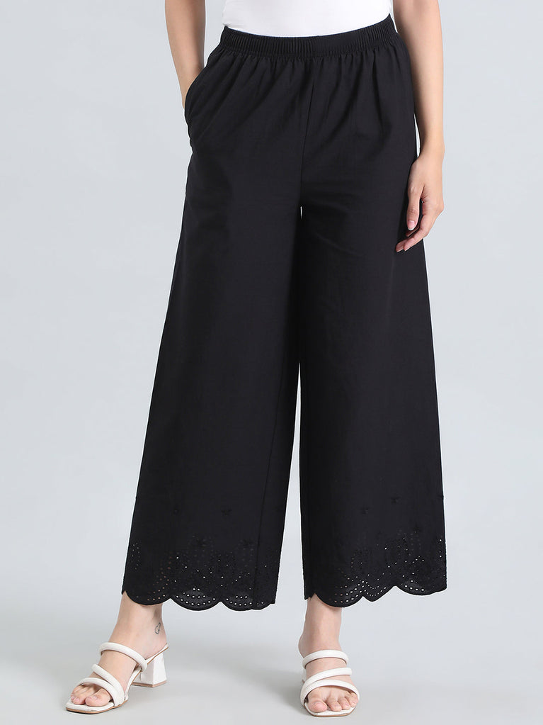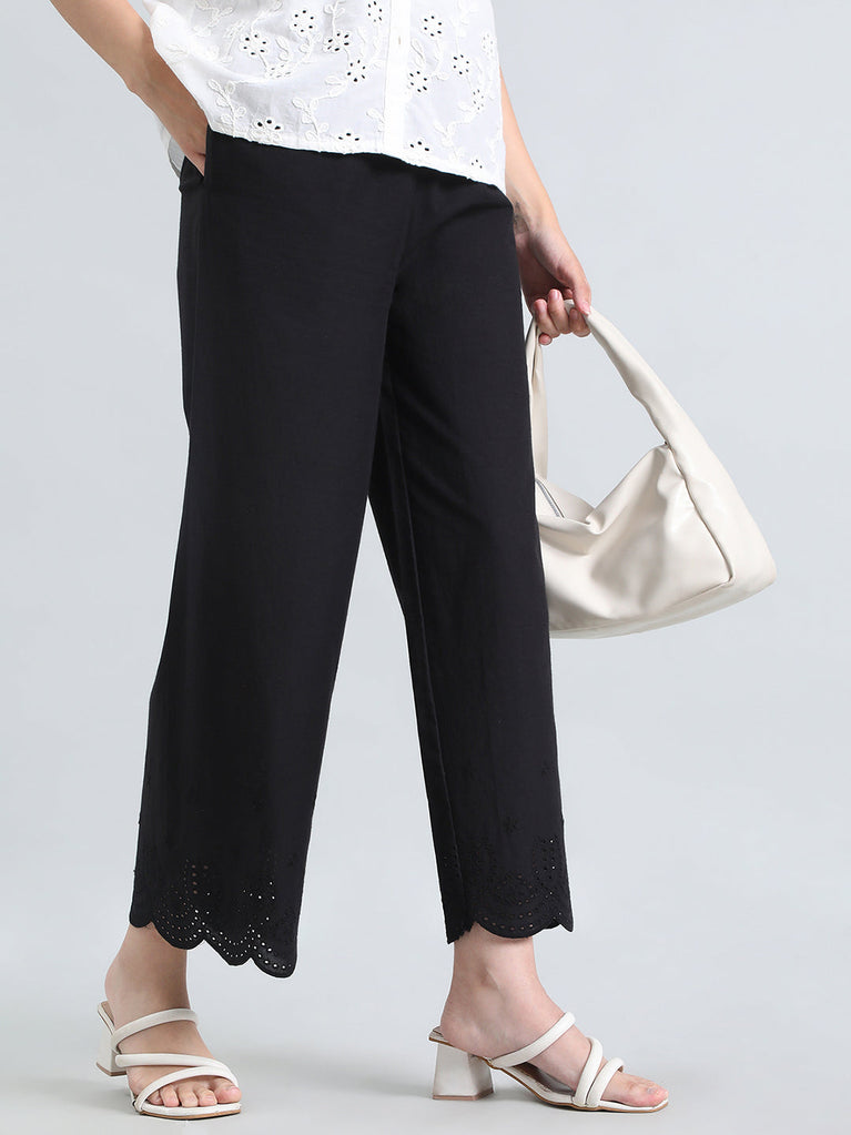 Crafted from breathable cotton, our Black Hakoba Palazzo offers a relaxed fit with a mid-rise waist featuring adjustable inner drawstrings and ankle-length cut. Detailed with Schiffli embroidery at the hem and a side pocket, it blends everyday comfort with effortless ethnic elegance.