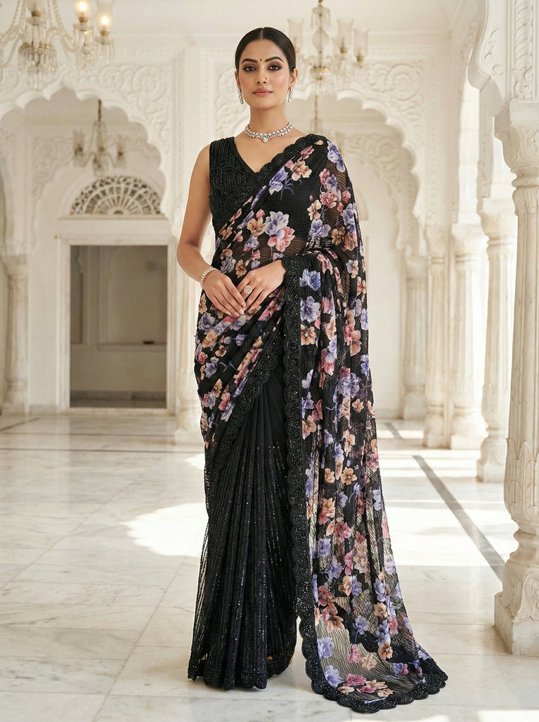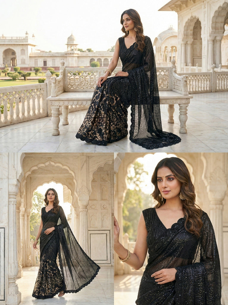 Elevate your ethnic wardrobe with this stunning black net saree, meticulously crafted with intricate floral sequin and bead embellishments. The sheer net fabric creates an ethereal drape while the heavy embroidery work adds dramatic visual impact, making it ideal for weddings, celebrations, and special occasions. The coordinated readymade blouse ensures effortless styling, allowing you to look polished without additional tailoring. Perfect for those seeking sophisticated traditional wear with contemporary flair.