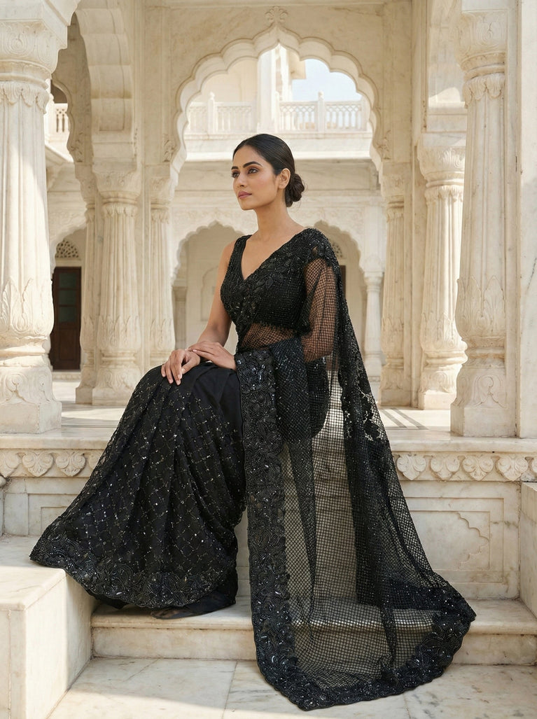 Black Net Saree with Cutdana Blouse & Jaal Pallu