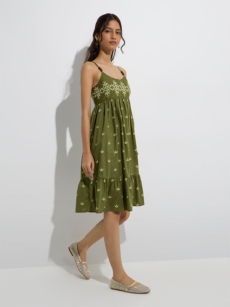Bombay Paisley introduces this olive dress adorned with botanical prints. Made from a cotton-rich fabric, it flaunts a tiered silhouette with a scoop neckline, adjustable straps and a smocked back for added comfort and ease of movement.