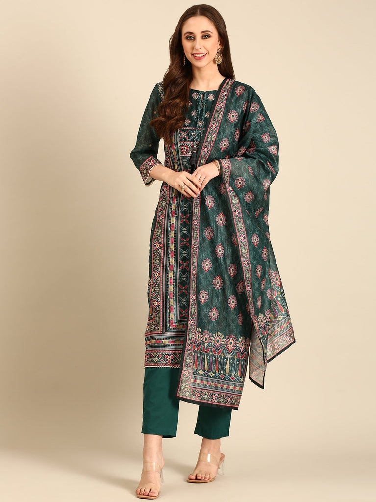 Experience elegance with this Bottle Green Suit Set crafted from soft muslin fabric featuring a delicate computer-printed design. The flattering V-neck is enhanced with intricate gotta patti lace, adding a touch of traditional charm. Paired with a lightweight organza dupatta, this ensemble promises comfort and style for any occasion. Elevate your wardrobe with this blend of classic craftsmanship and contemporary appeal.