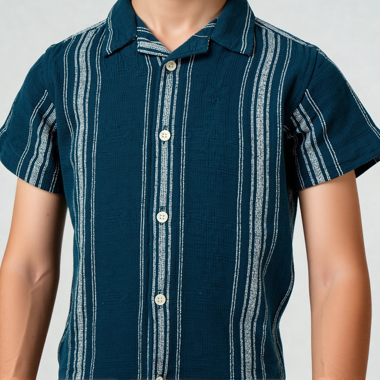 Experience the perfect blend of comfort and style with our Boys Striped Camp Collar Retreat Half Sleeve Shirt. Crafted from 100% cotton, this shirt ensures breathability and softness, making it ideal for all-day wear. The classic striped pattern and camp collar add a touch of sophistication, perfect for both casual outings and special occasions.