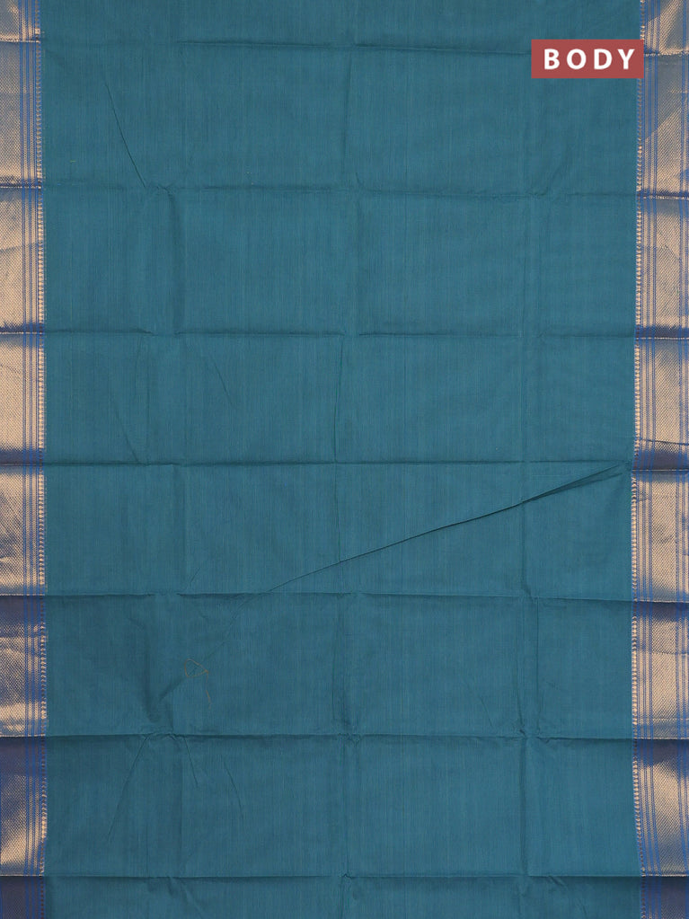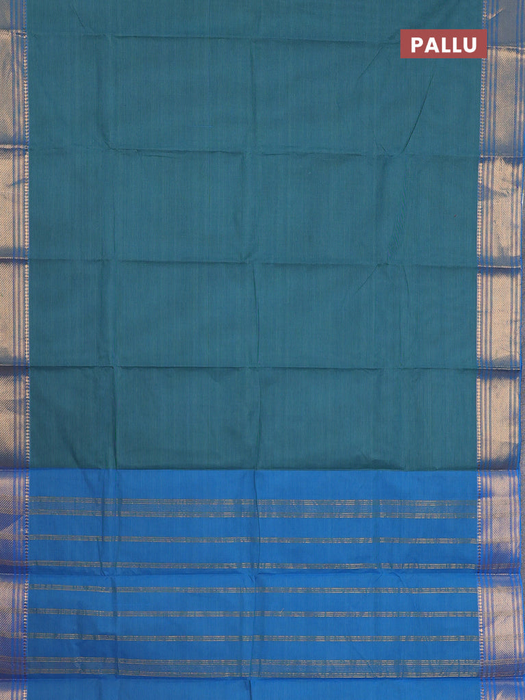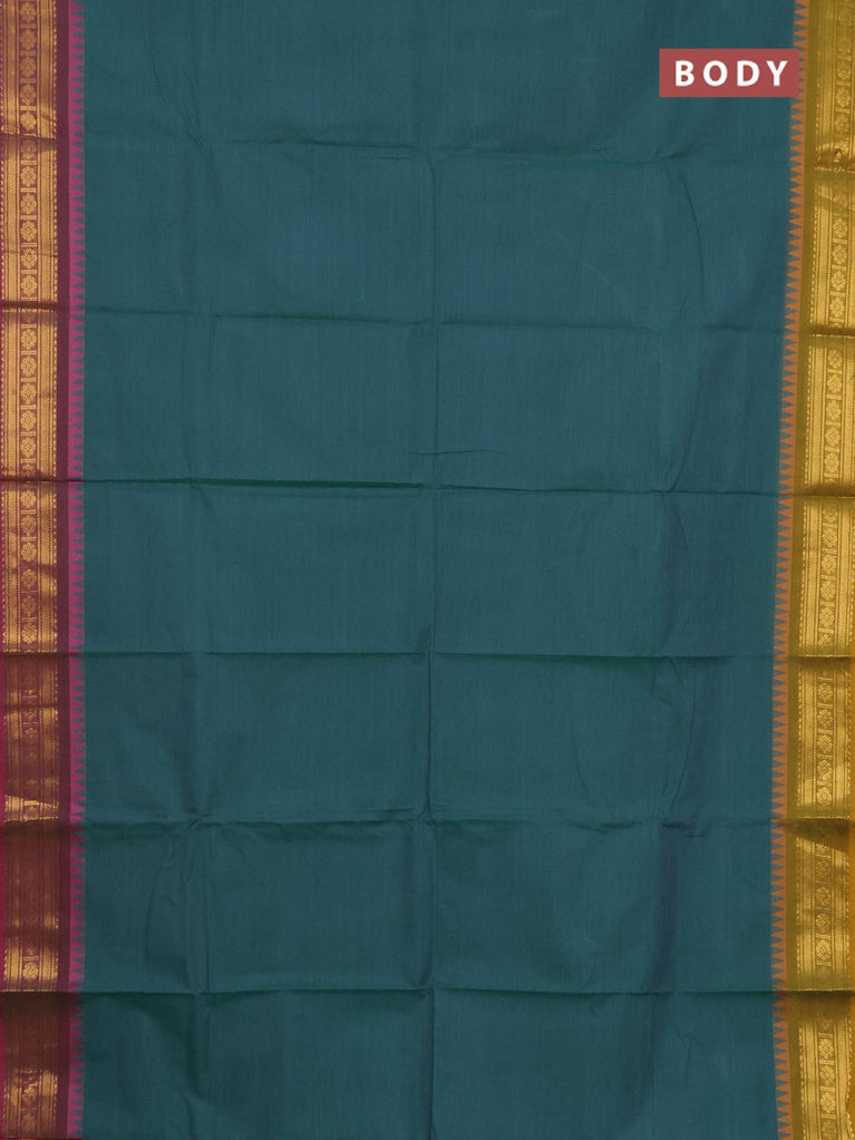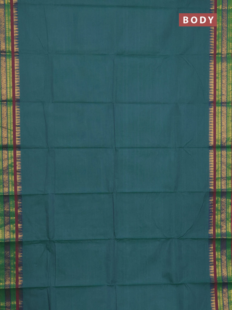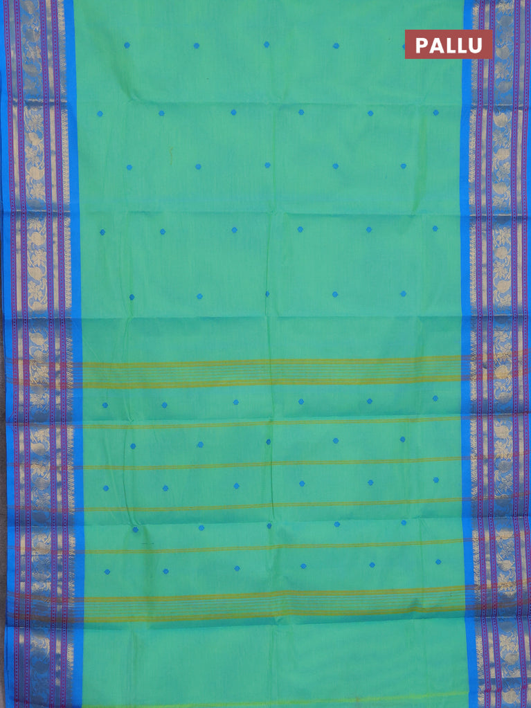 Chettinad cotton saree teal green and blue with thread woven buttas and temple disign zari woven border