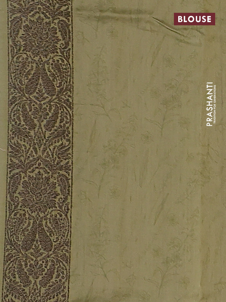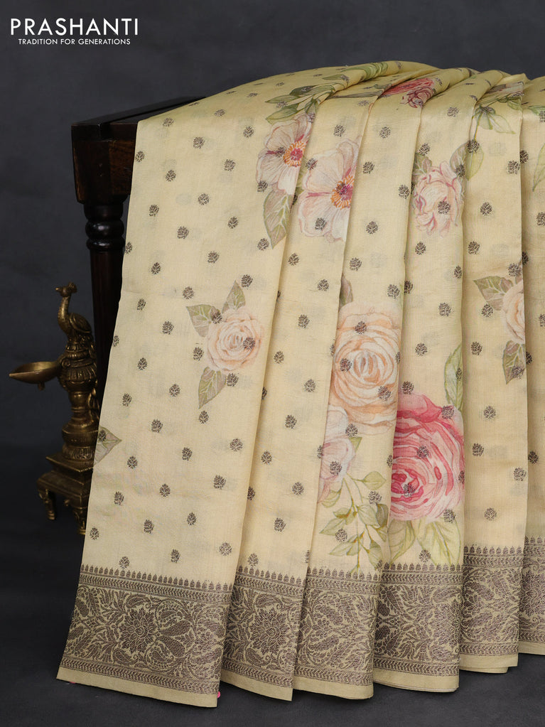 Chiniya silk saree pale yellow and elaichi green with allover woven buttas & digital prints and banarasi style border